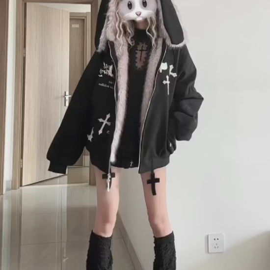 ふわっと暖かいムートン質感に、悪魔バニーの耳と尻尾をプラスした地雷可愛い冬アウター。中綿入りで軽いのにしっかり防寒、#ゆる地雷 の冬コーデにぴったり。