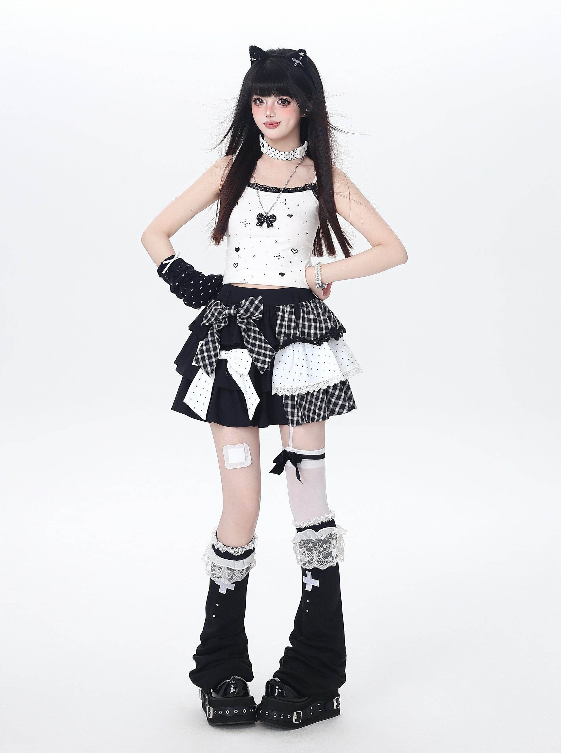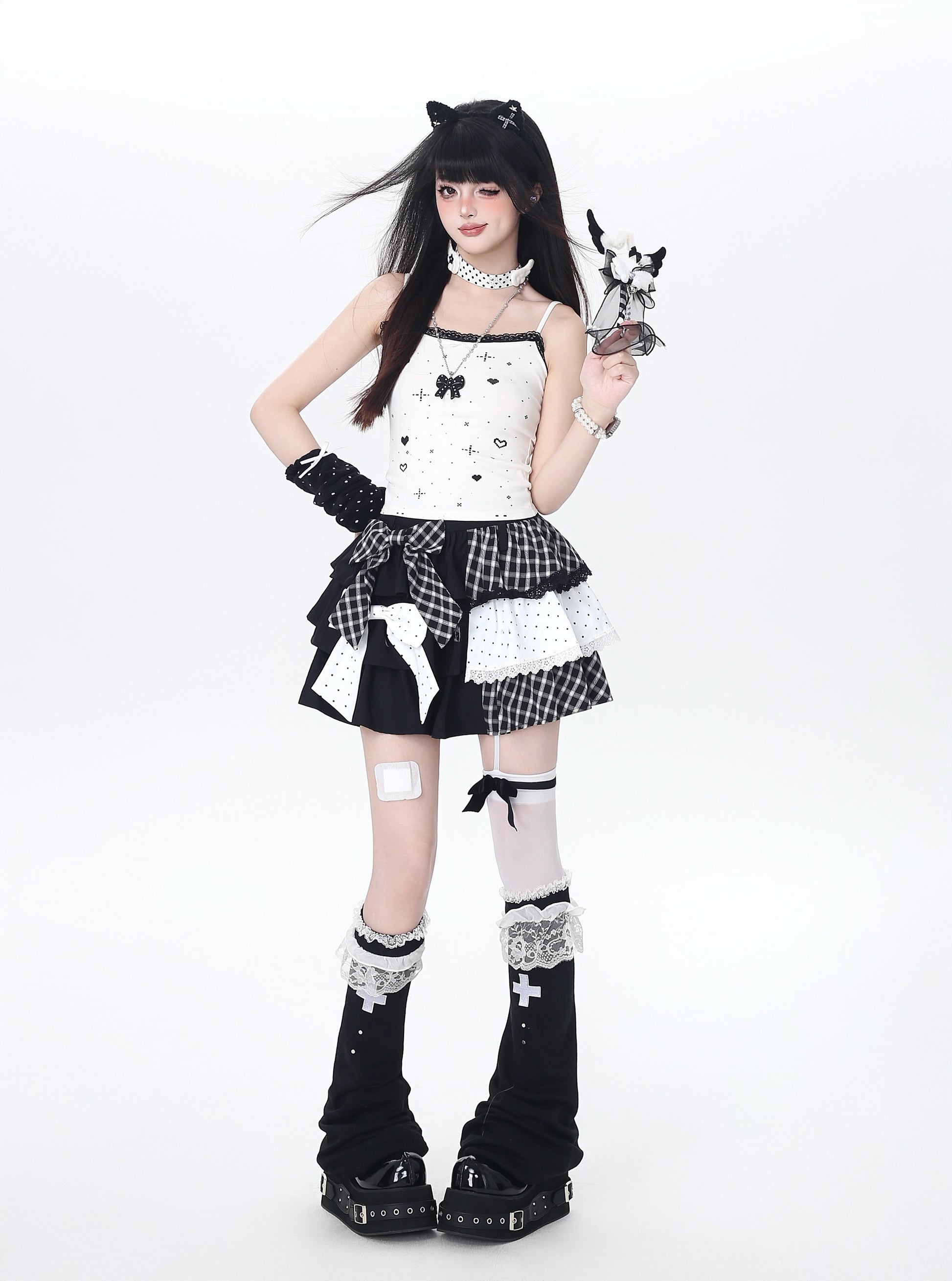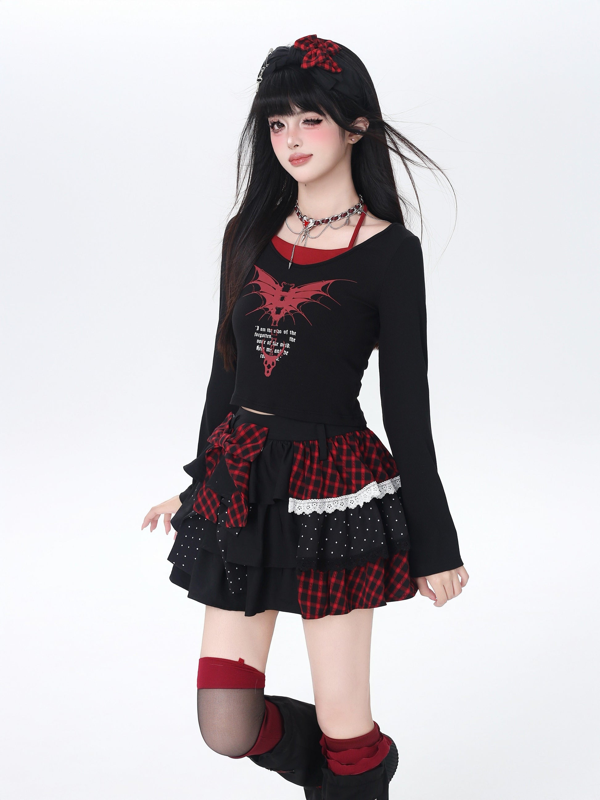 ドット×チェックの切り替えが可愛い、Y2Kムードたっぷりのティアードスカート🖤