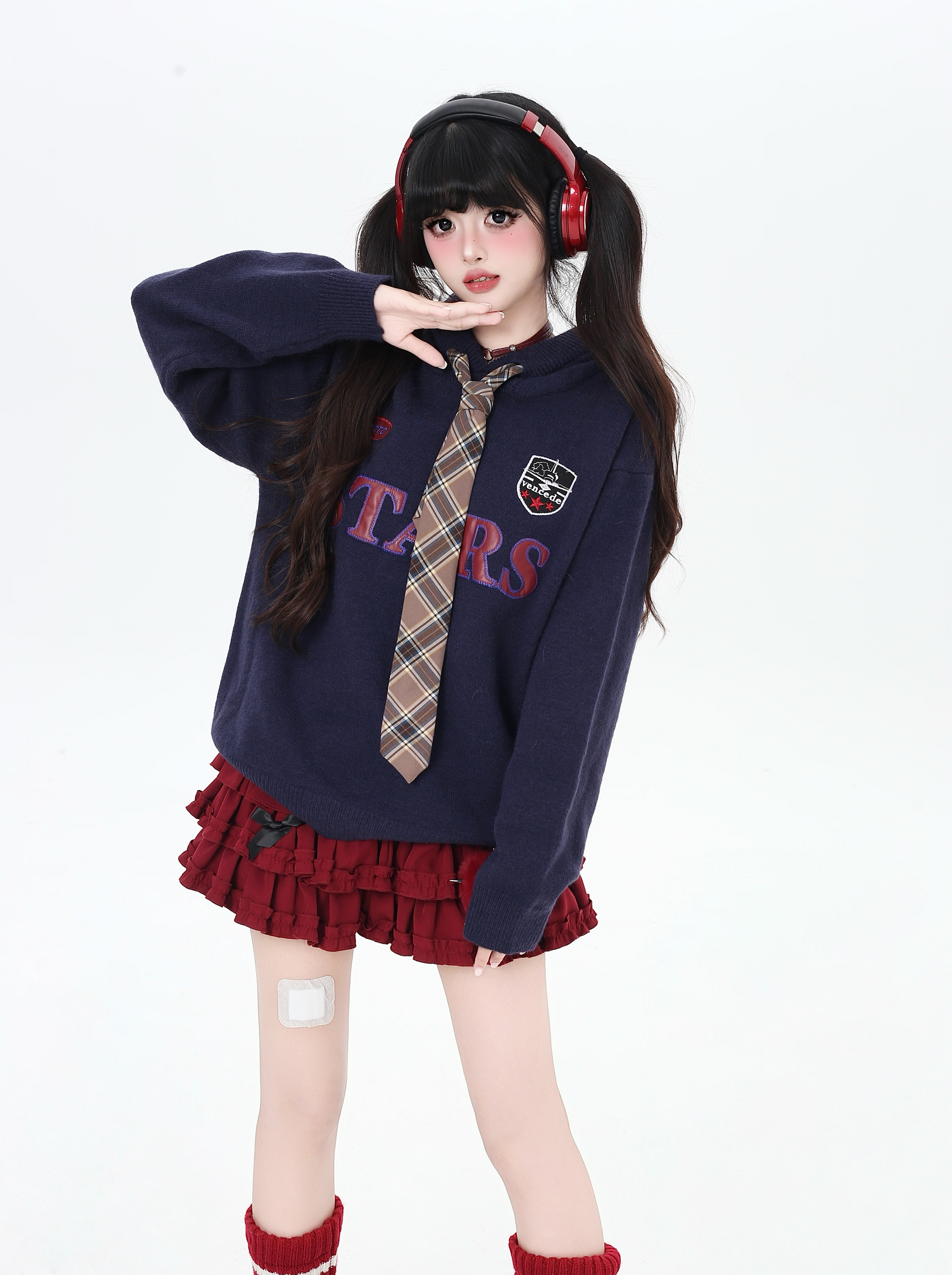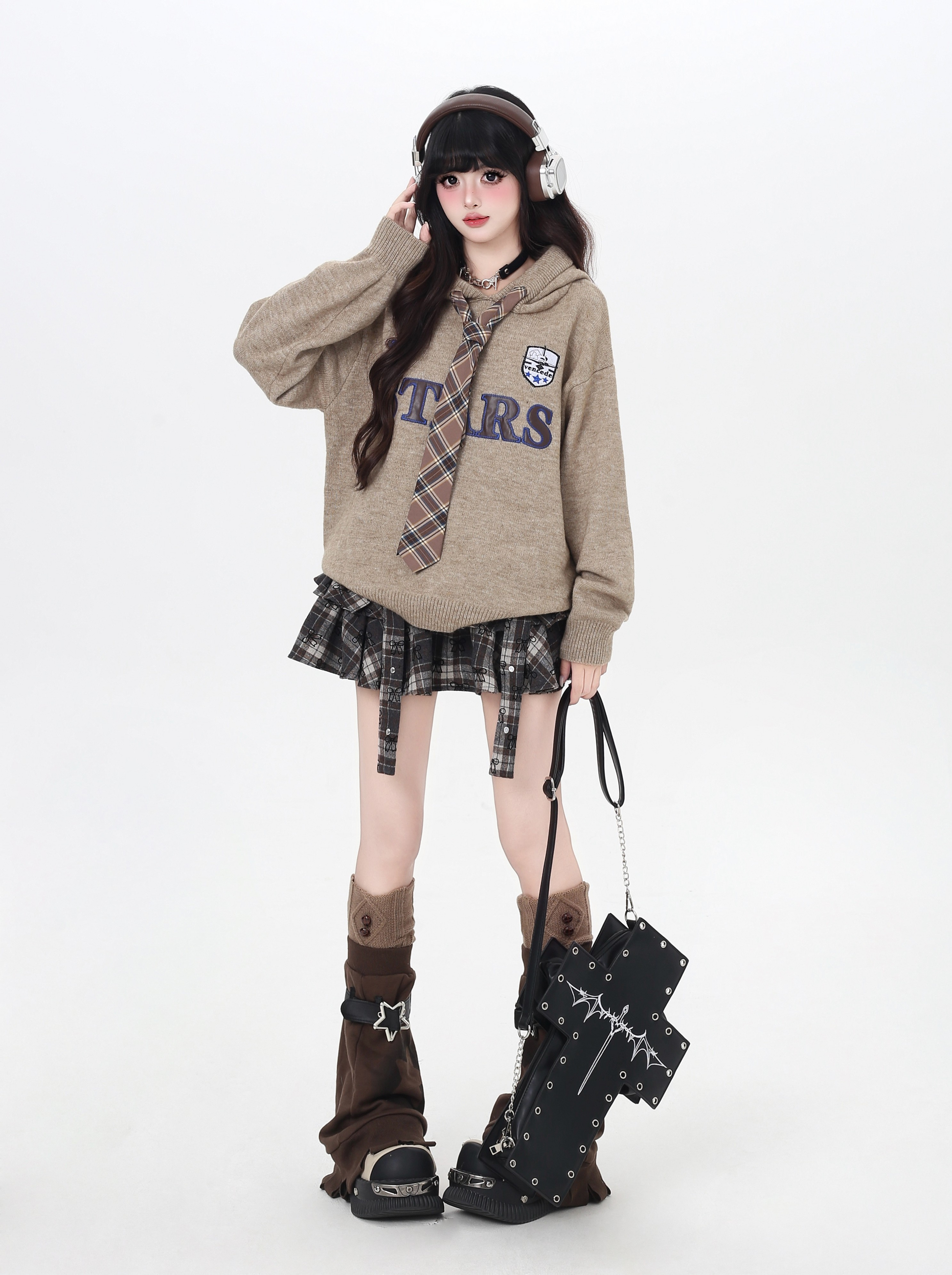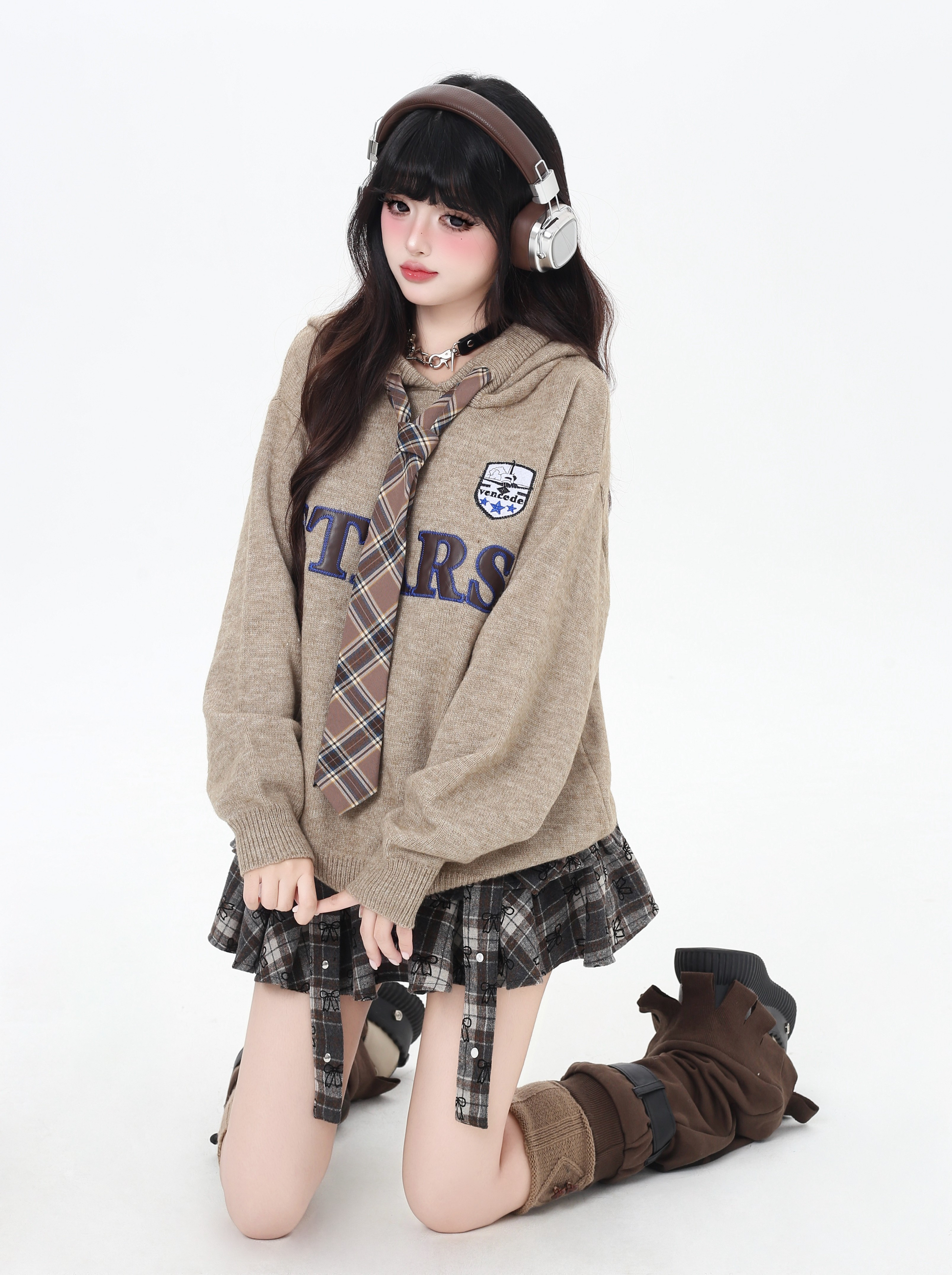 アルファベット刺繍とネクタイデザインがポイントのスクール風フーディーで、秋冬のゆるカジュアルコーデにぴったり。量産型コーデや推し活、OOTDにも映える、デイリーにも特別な日にも使いやすい万能ニットです。