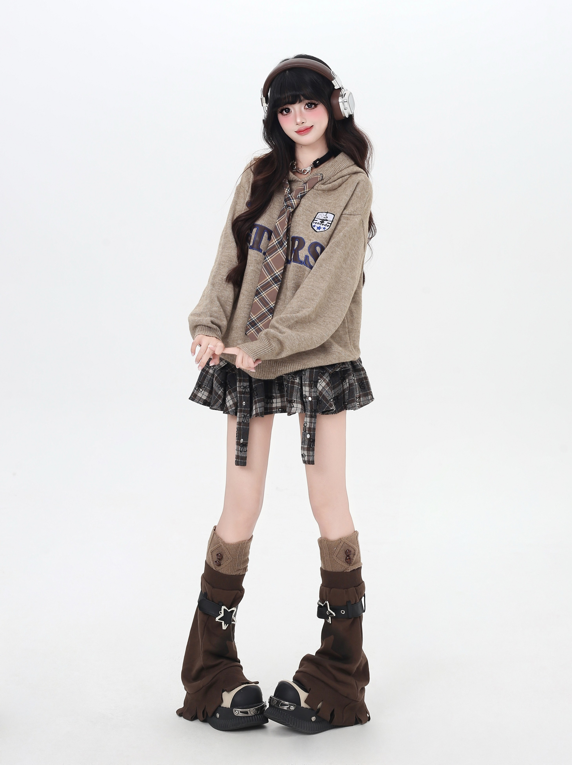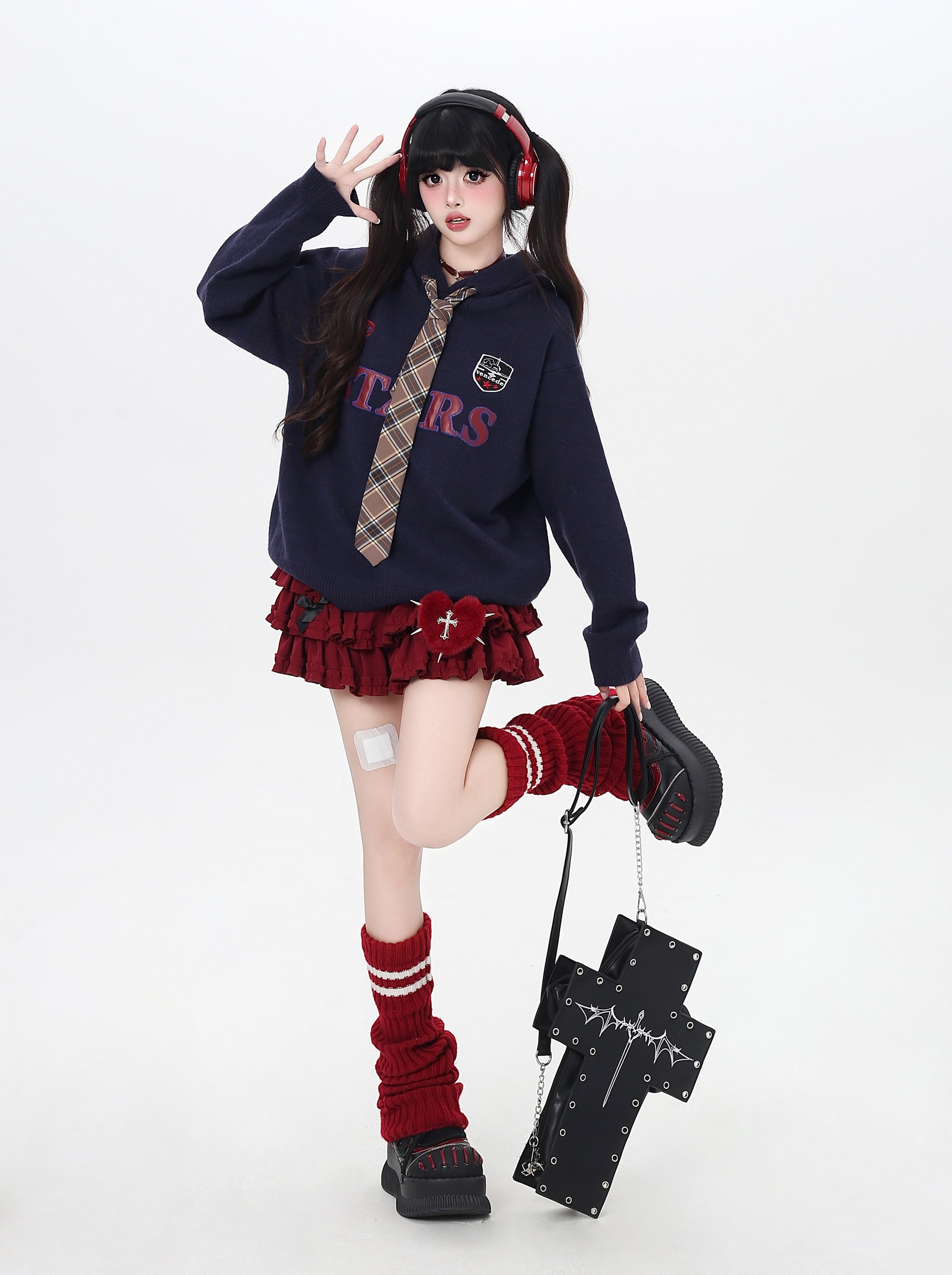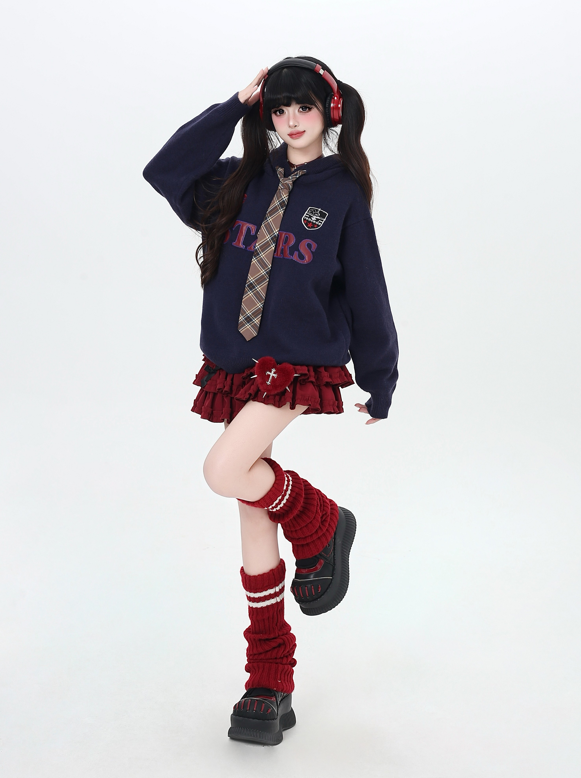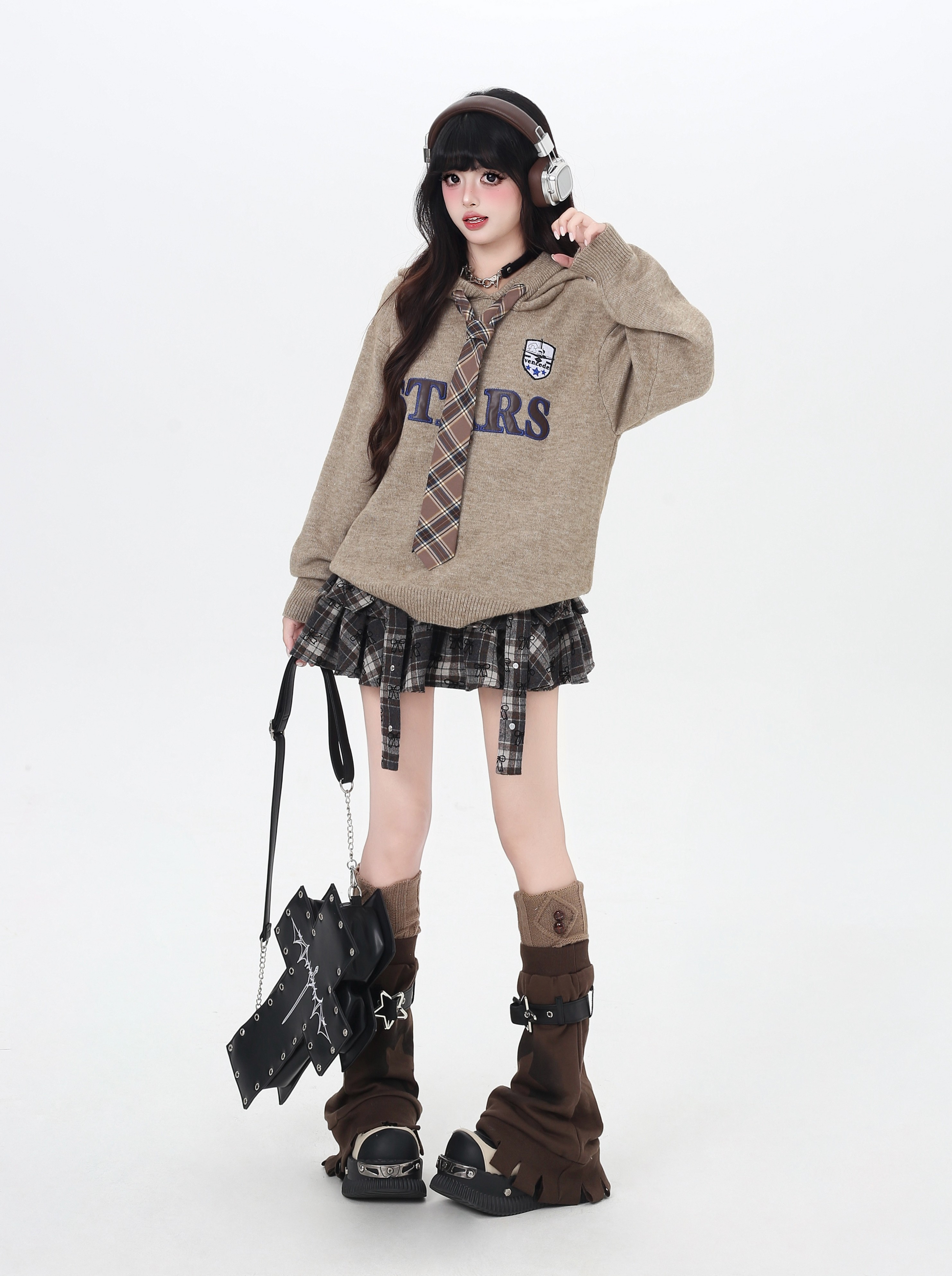 アルファベット刺繍とネクタイデザインがポイントのスクール風フーディーで、秋冬のゆるカジュアルコーデにぴったり。量産型コーデや推し活、OOTDにも映える、デイリーにも特別な日にも使いやすい万能ニットです。