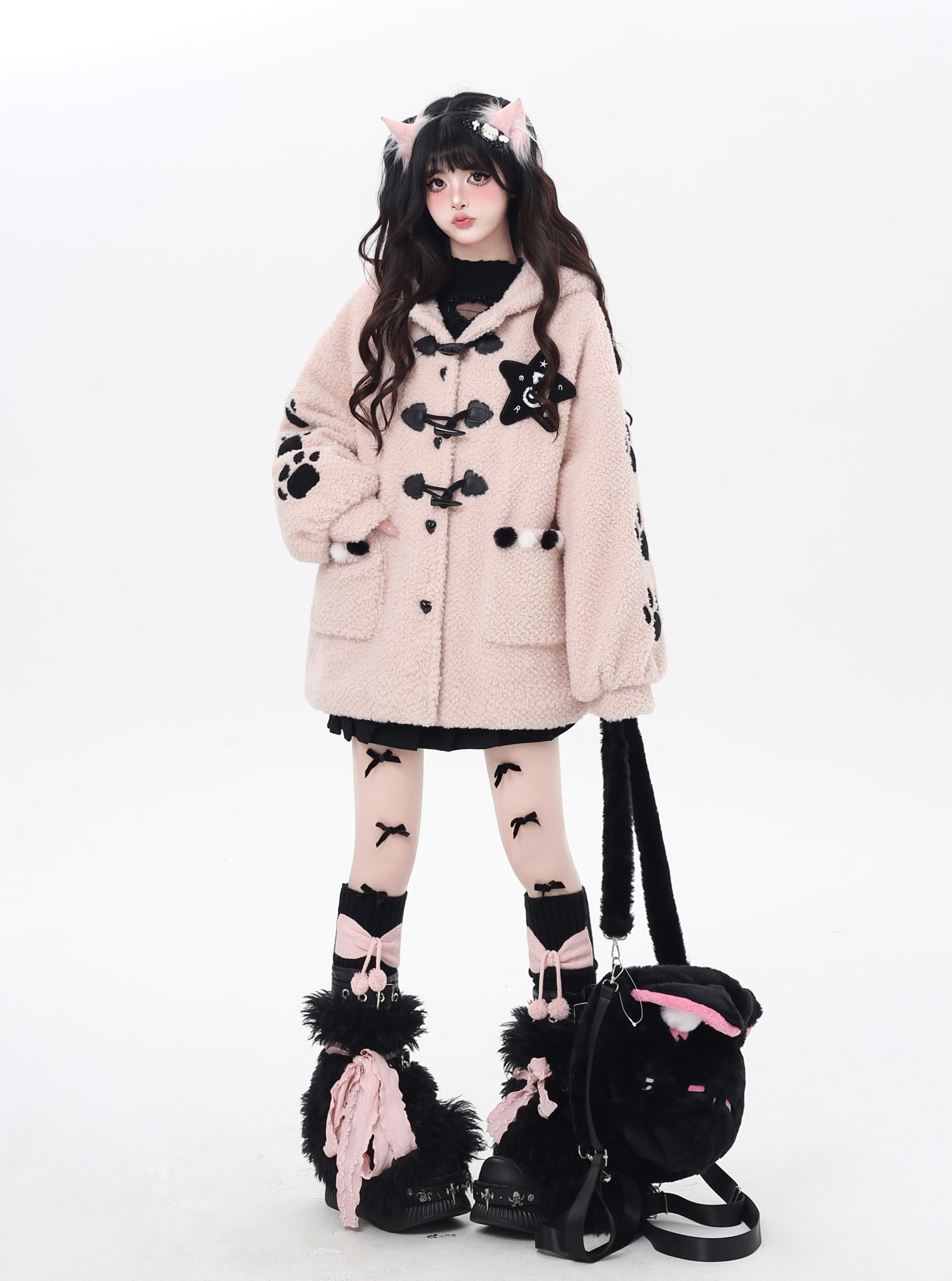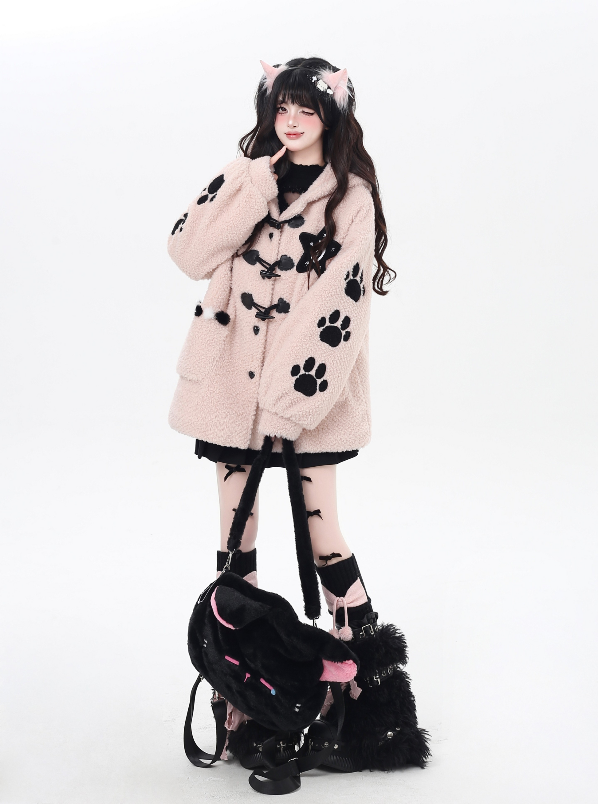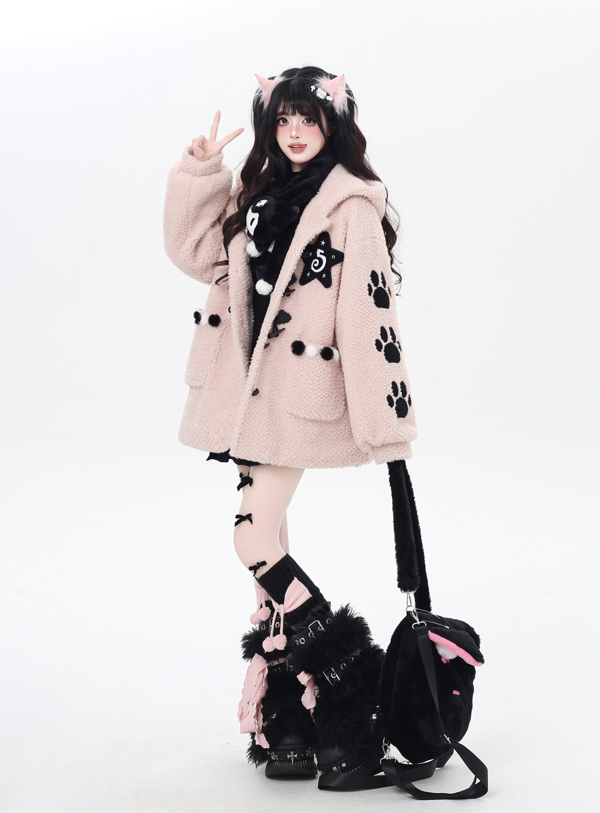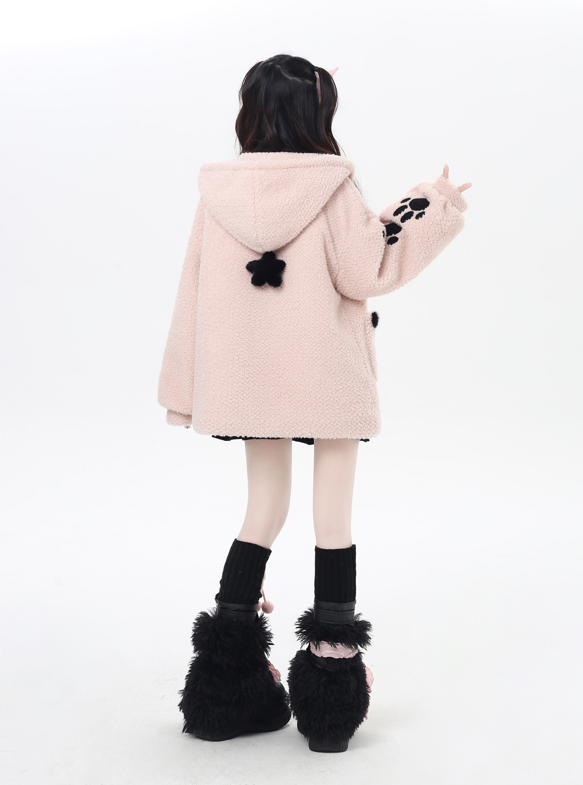 猫爪の刺繍とフード付きデザインが可愛い羊羔绒棉服で、冬のコーデにぴったりの保温アイテム。ふわもこ感とゆったりシルエットが量産型やゆるカジュアル、推し活やOOTDにも映える万能アウターです。