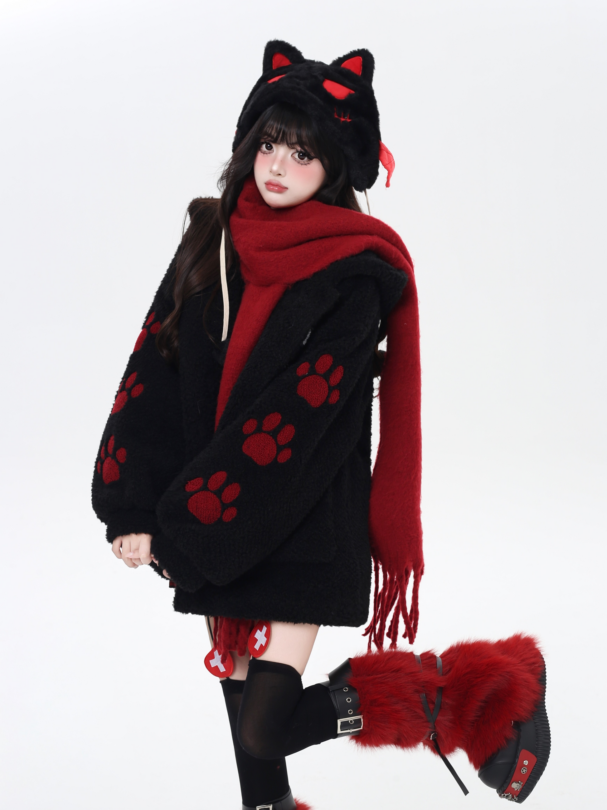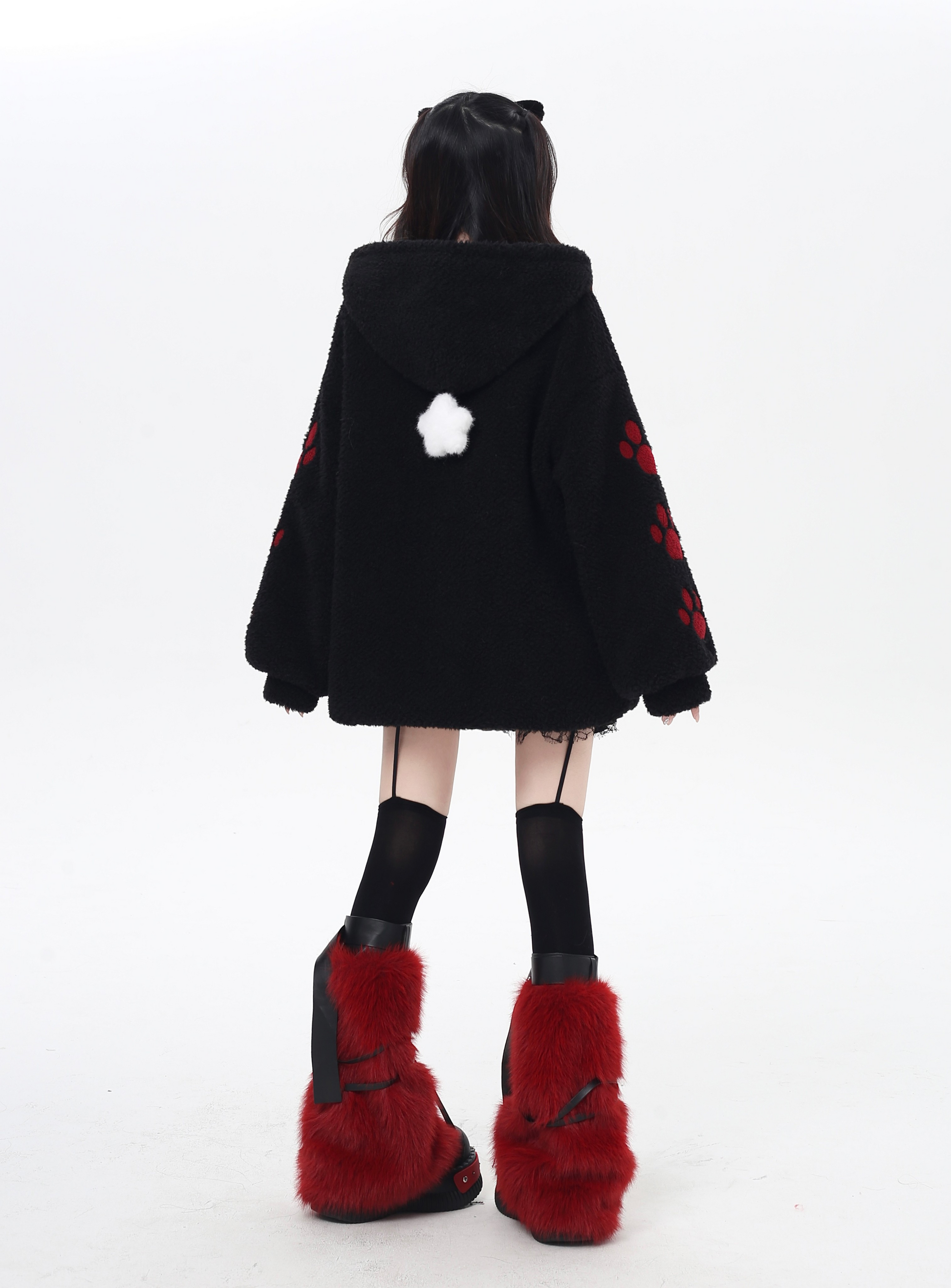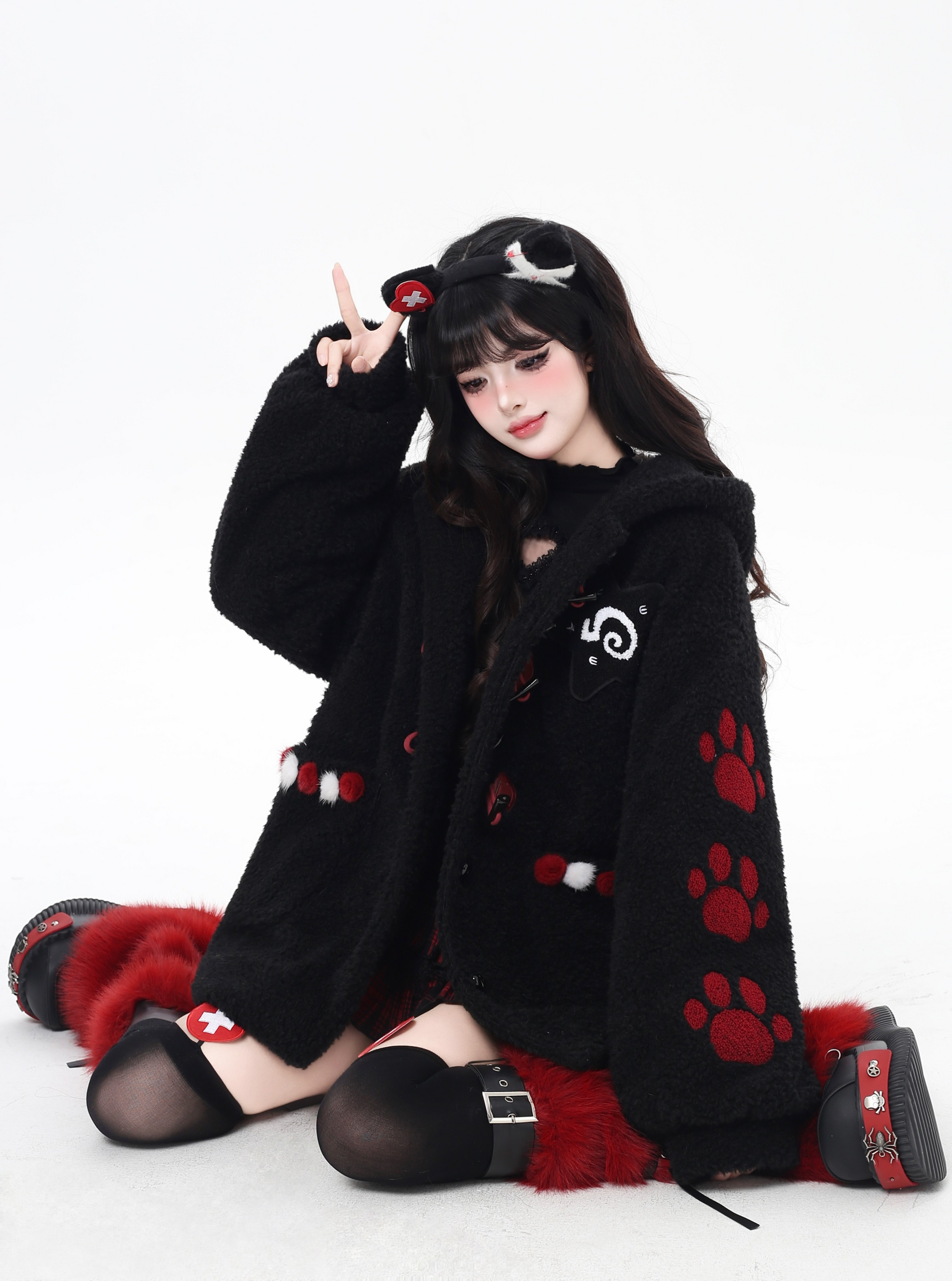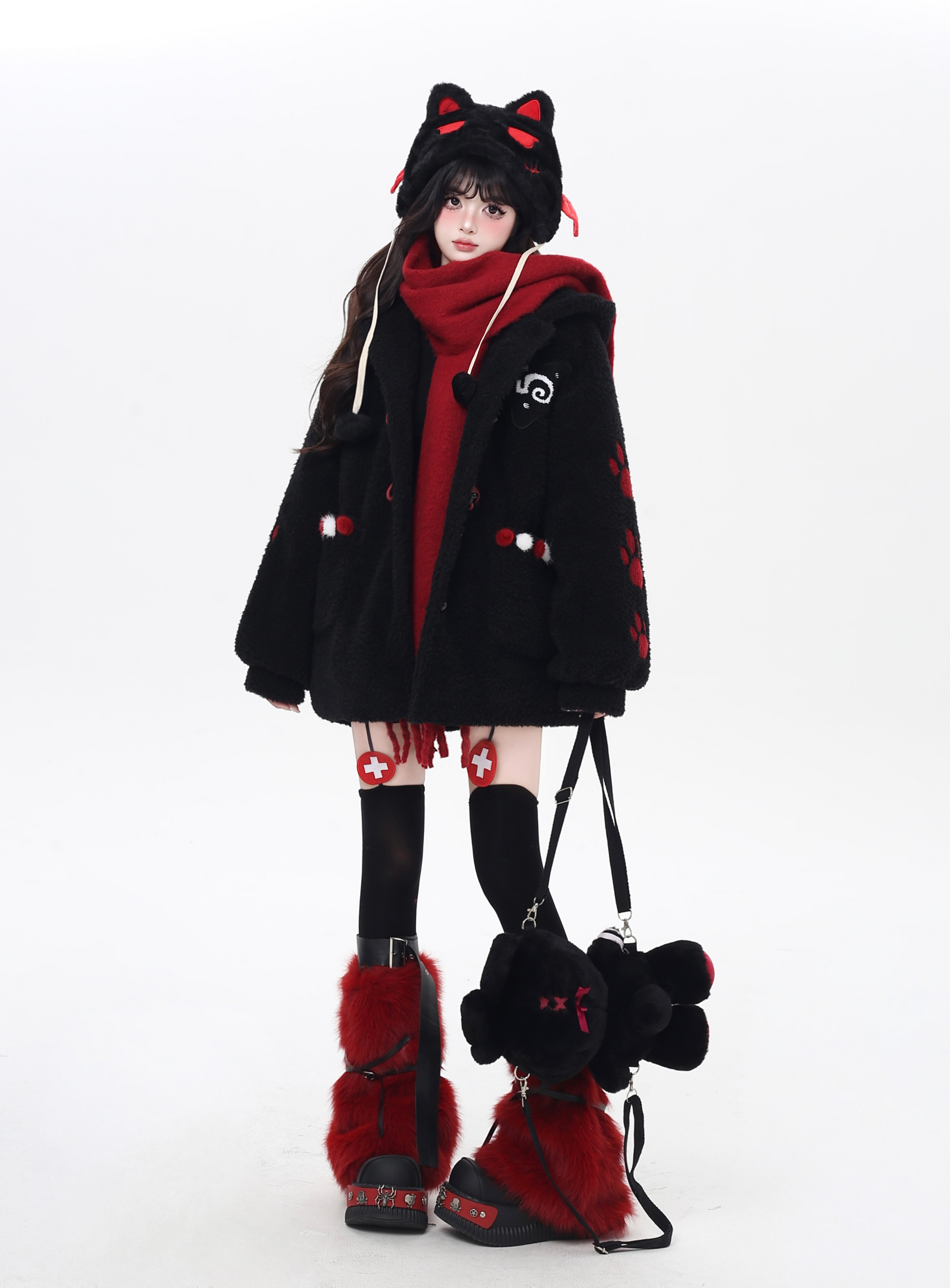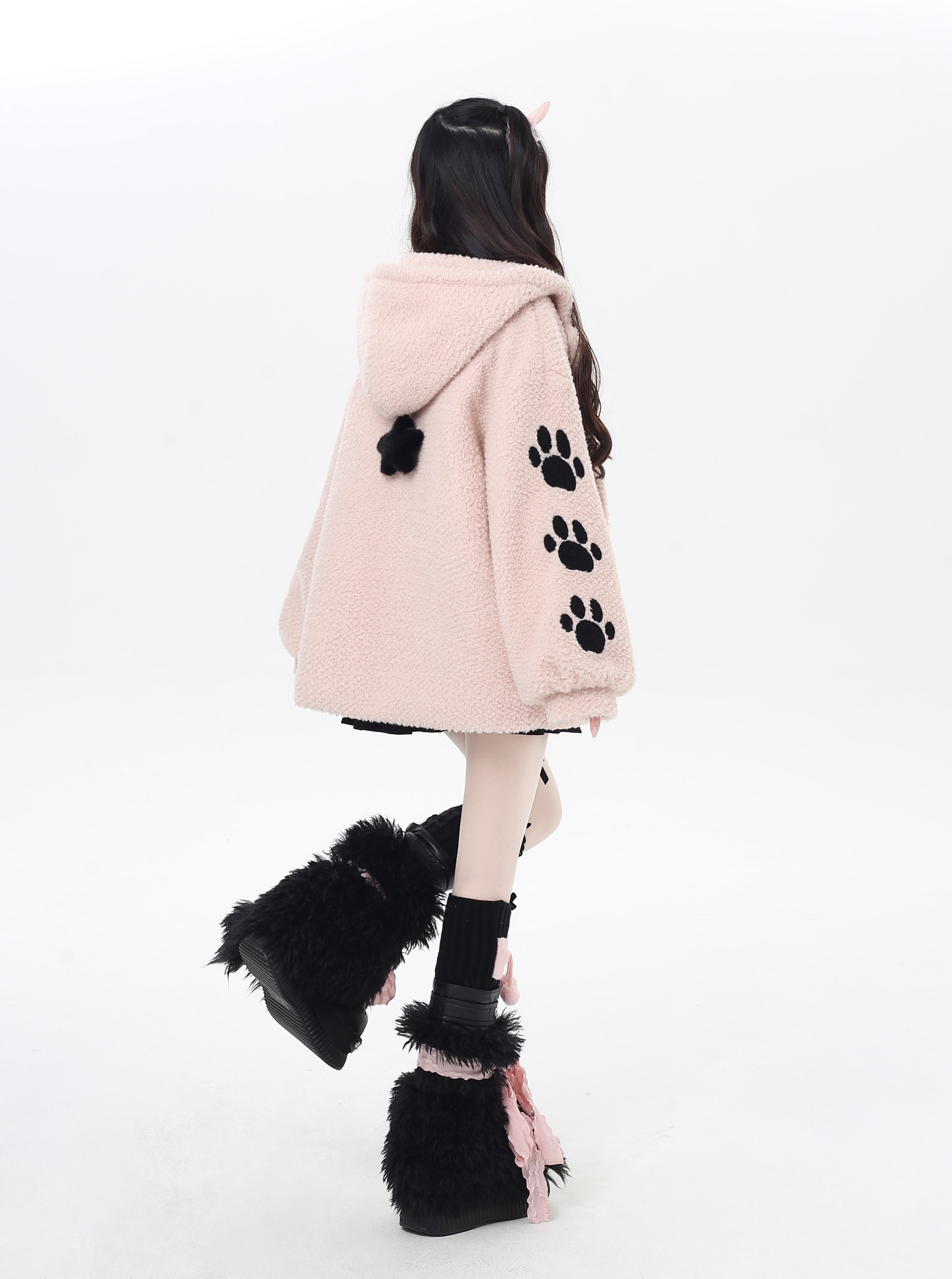 猫爪の刺繍とフード付きデザインが可愛い羊羔绒棉服で、冬のコーデにぴったりの保温アイテム。ふわもこ感とゆったりシルエットが量産型やゆるカジュアル、推し活やOOTDにも映える万能アウターです。