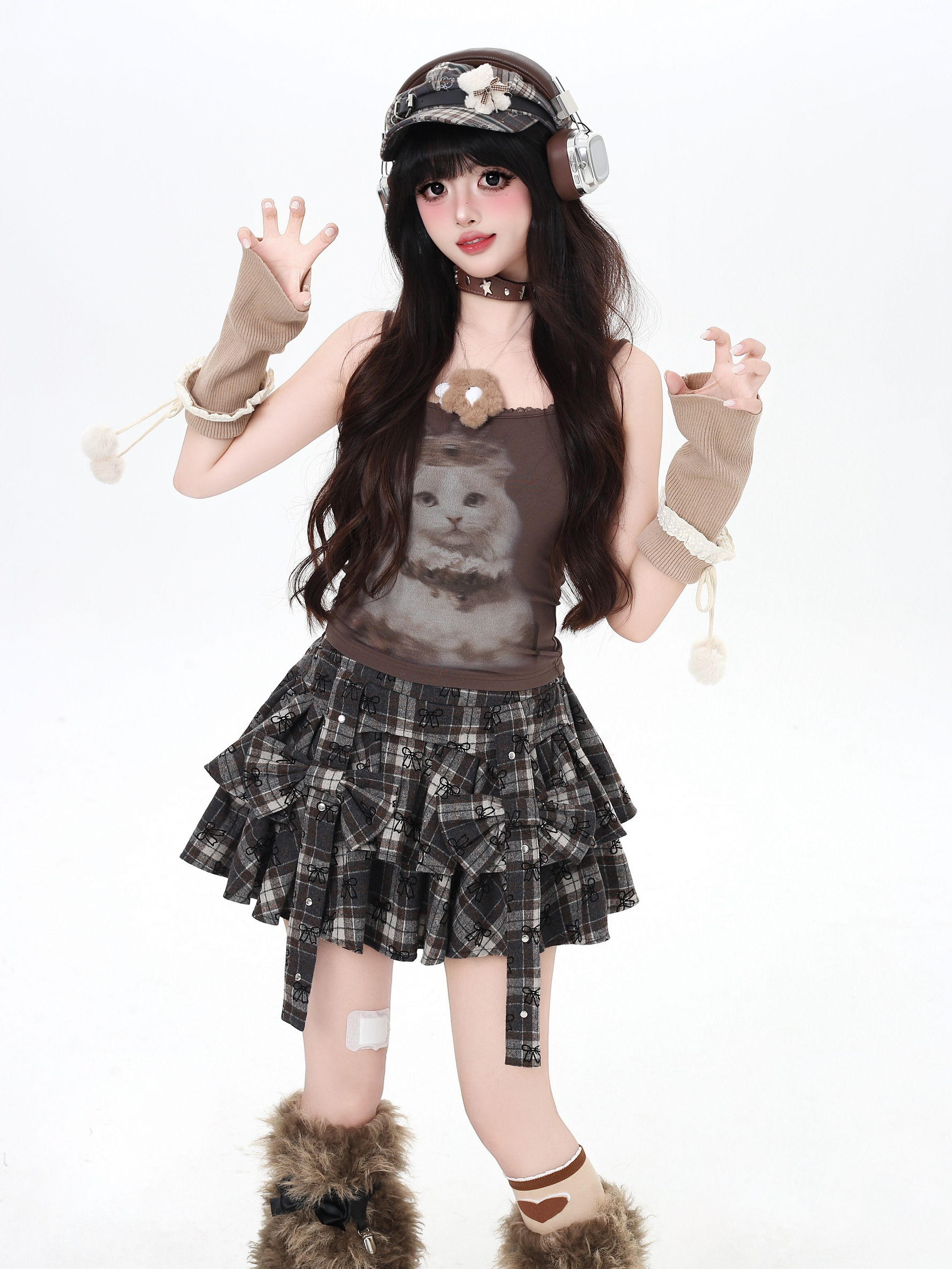 キャラメル色のチェックに大きめリボンを添えた、ふわふわレイヤードのガーリー蛋糕スカート。