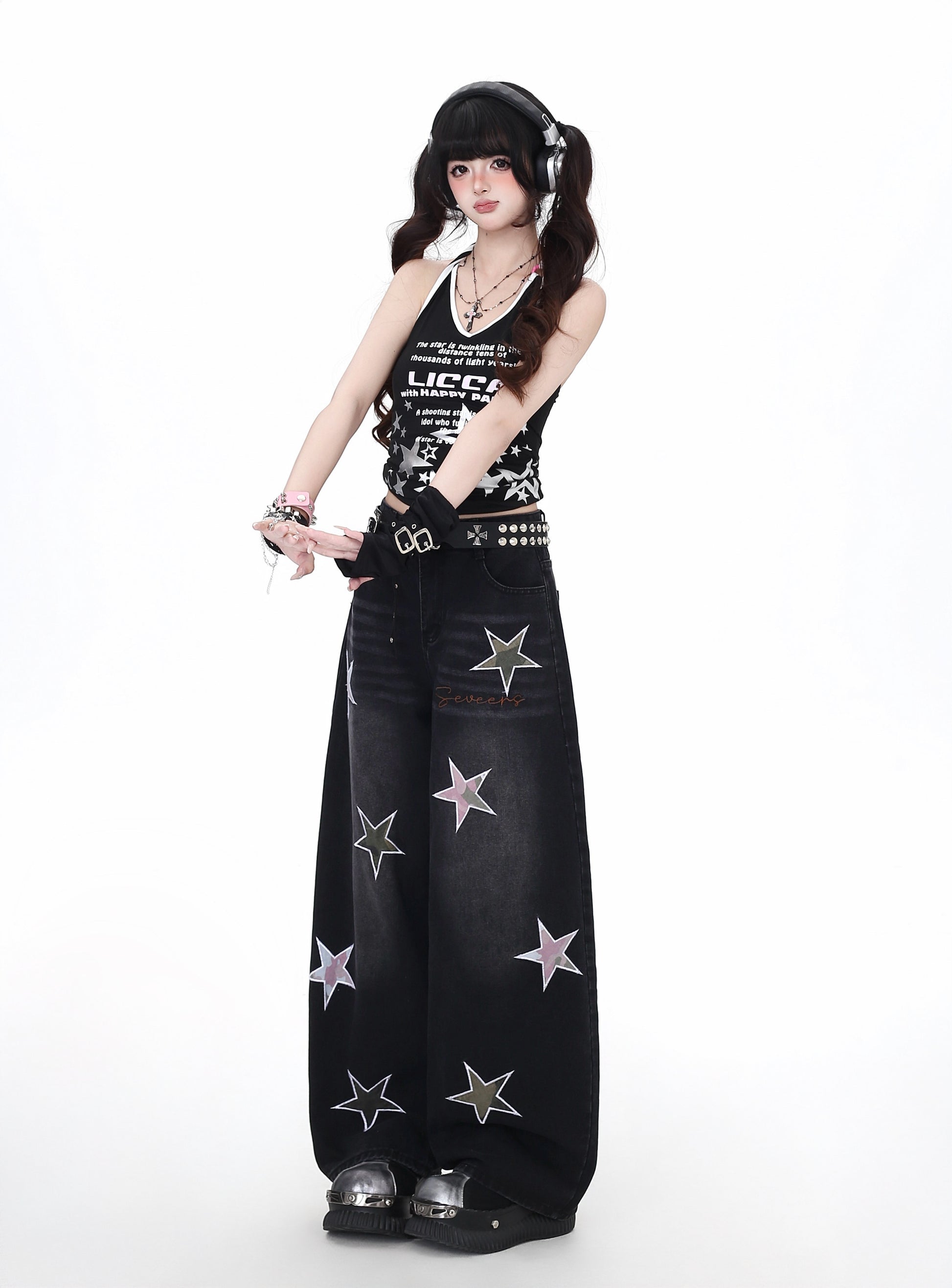 立体感のあるスターパッチと刺繍ディテールが目を惹くストレートデニム。