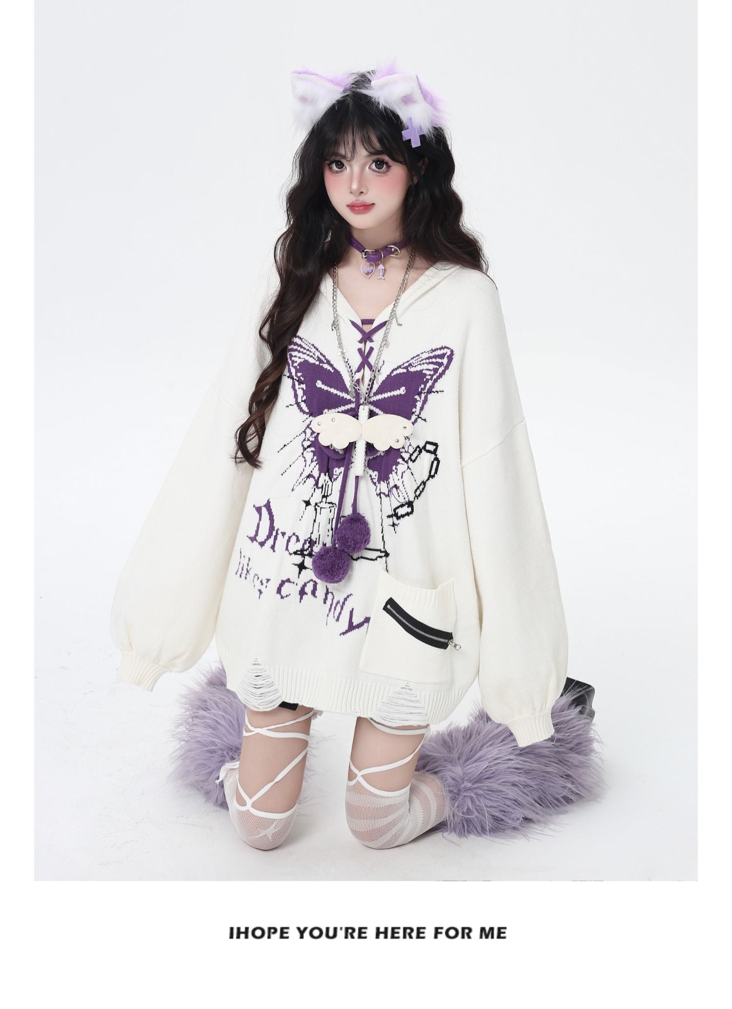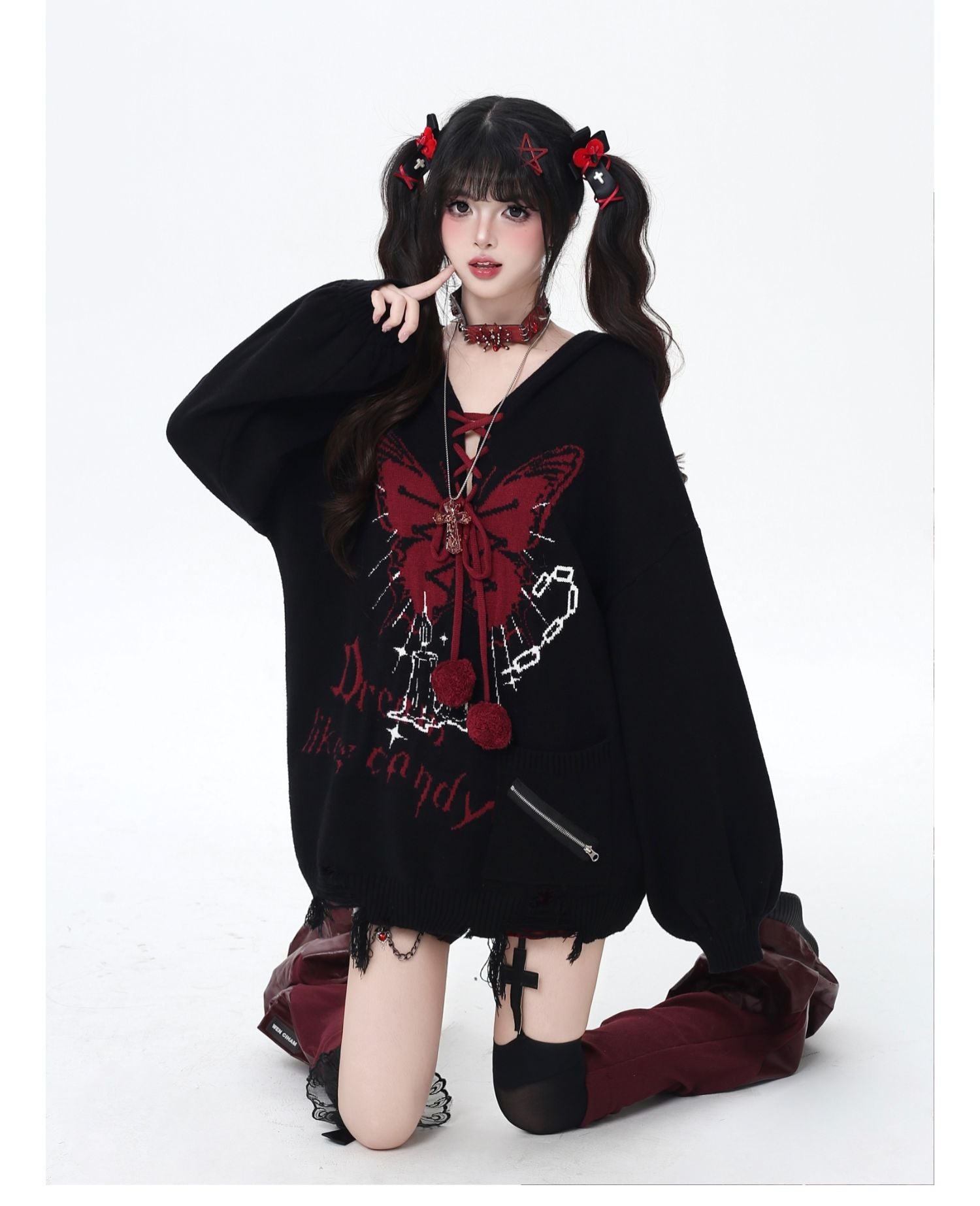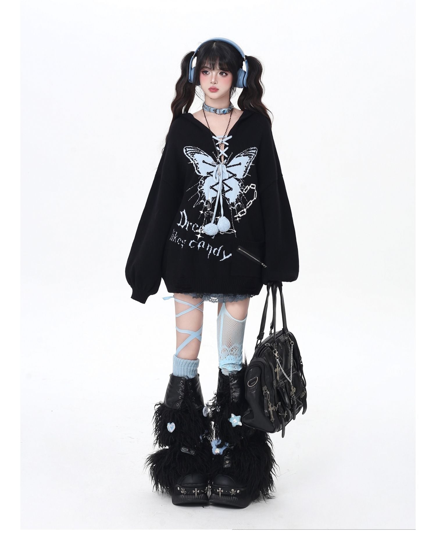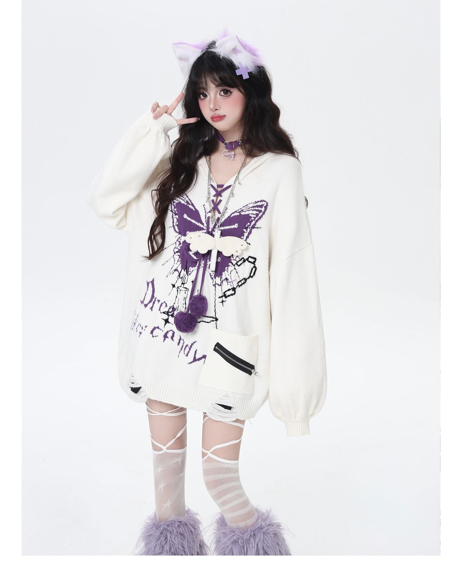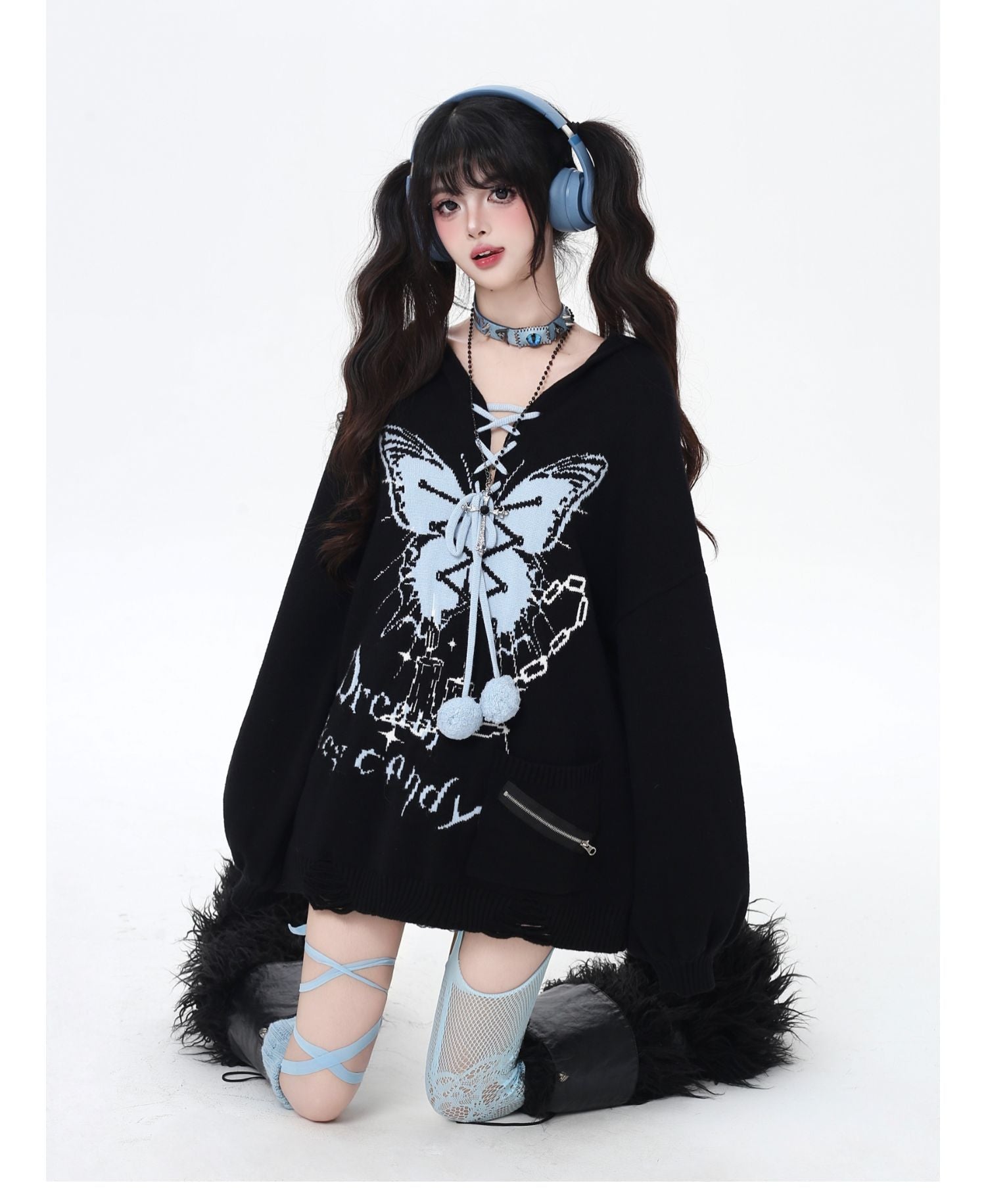 ゆったりフードつきパーカー、スパイダーウェブと蝶のデザイン
