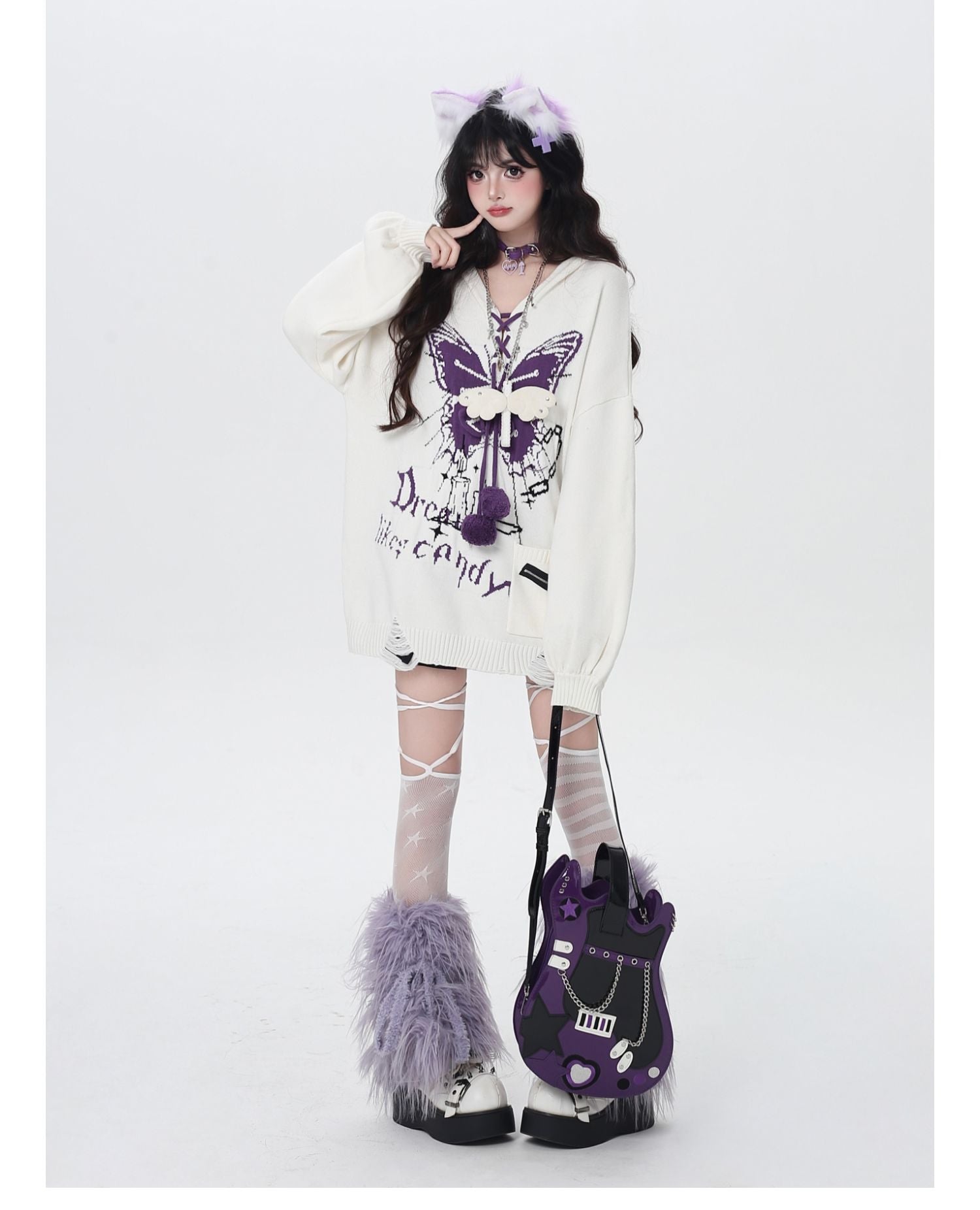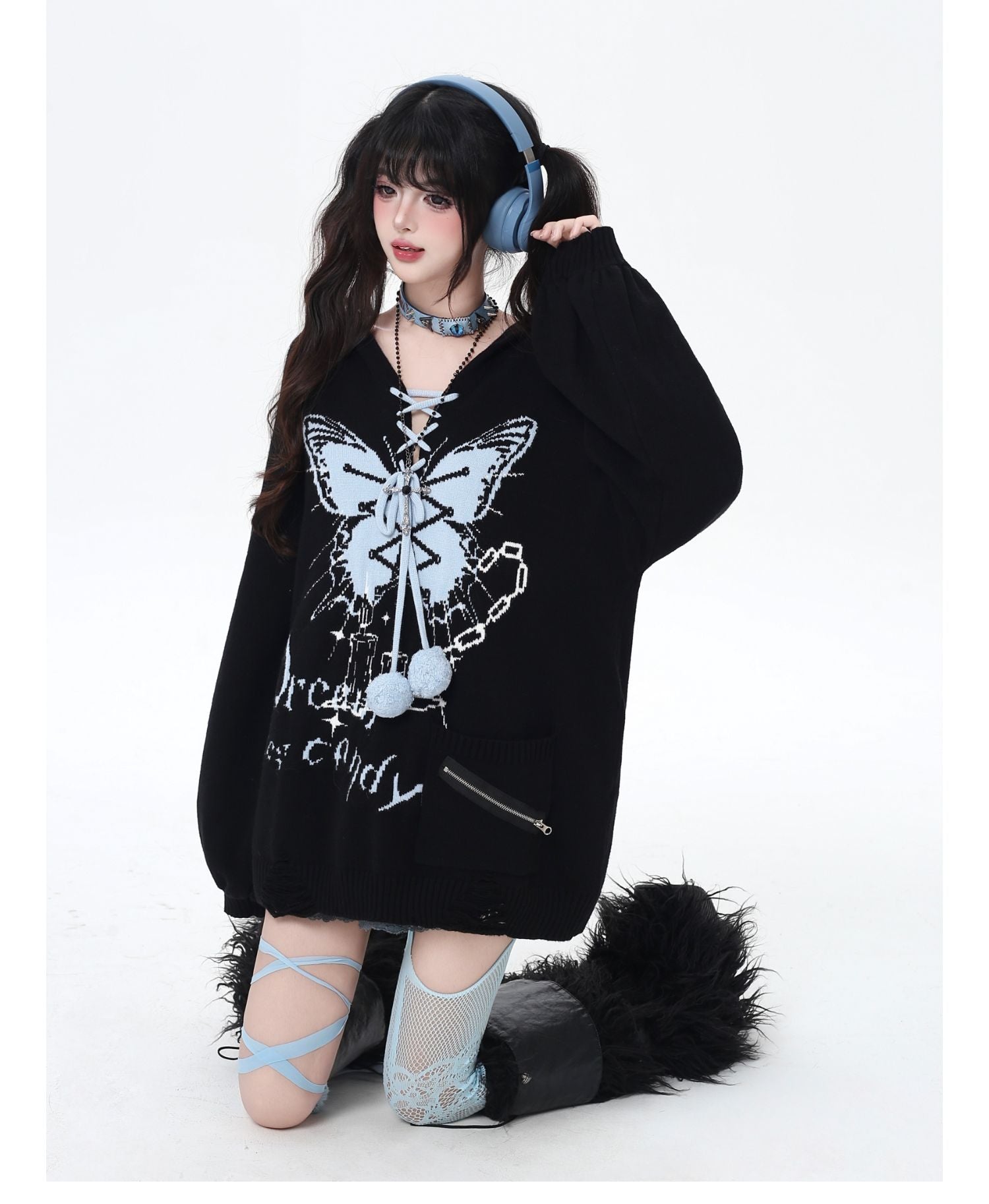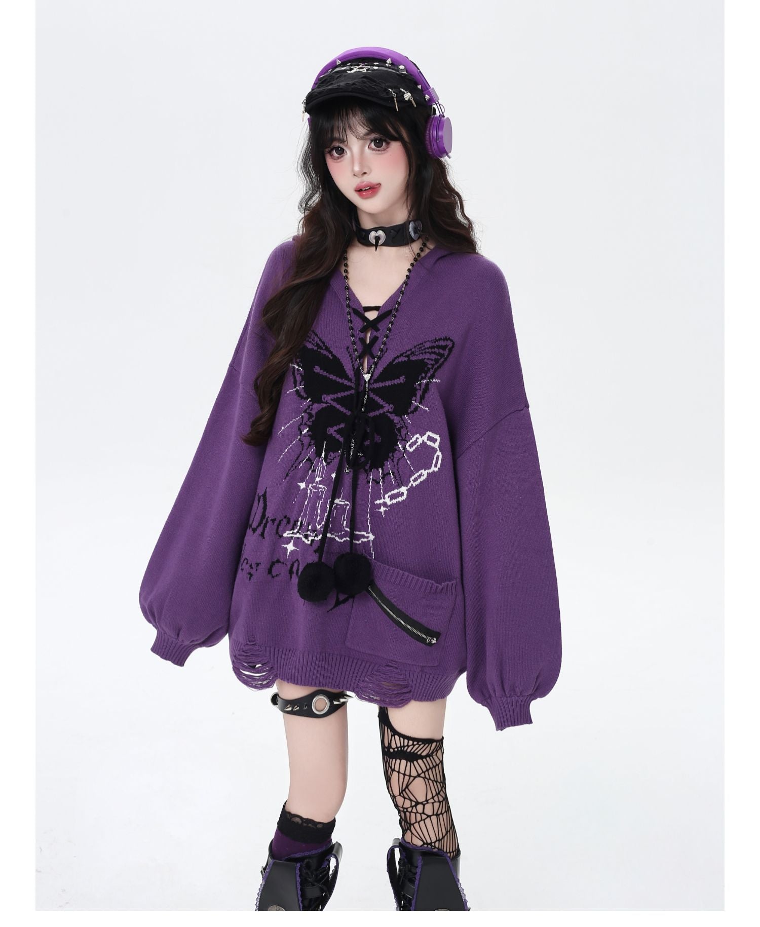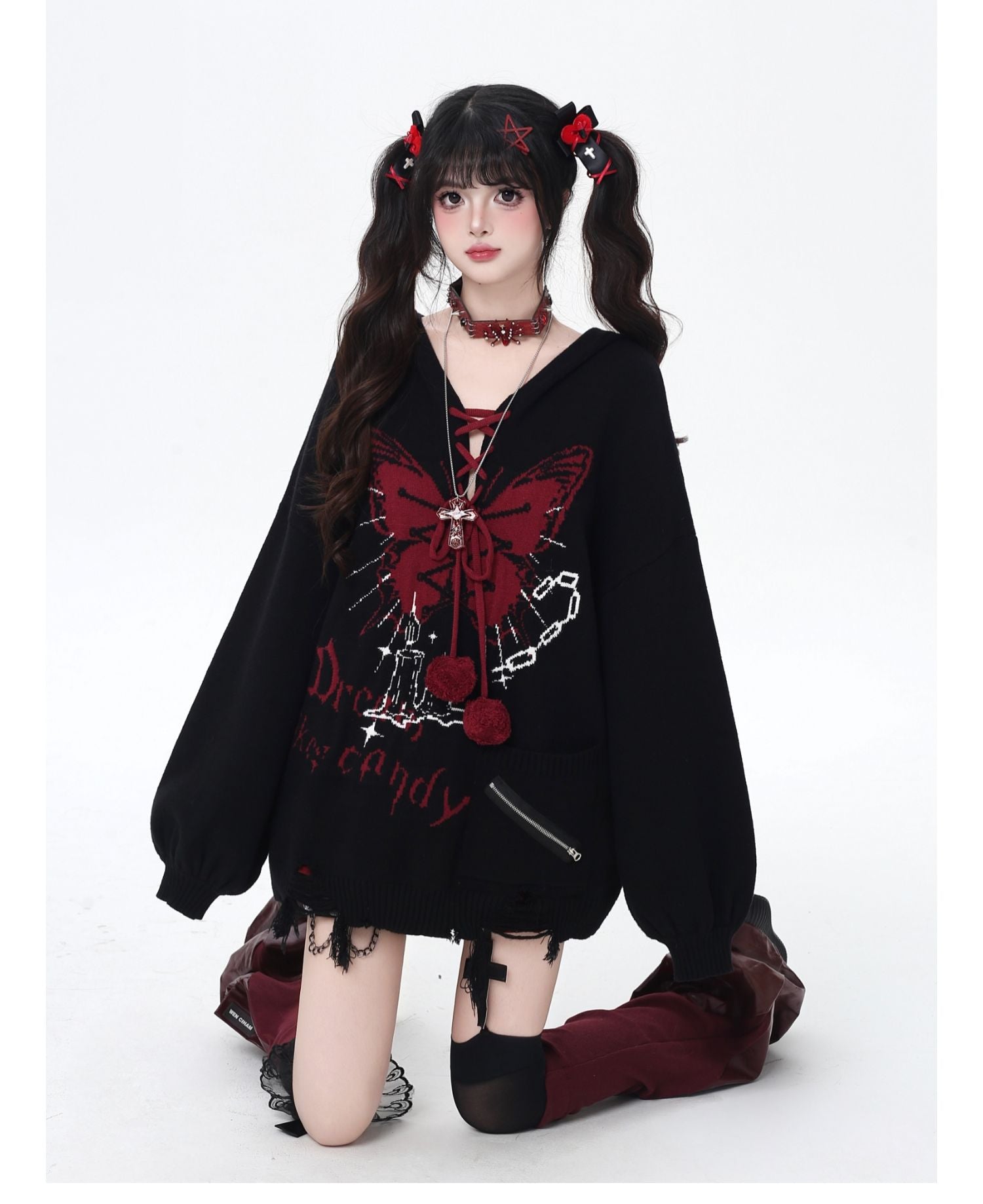 ゆったりフードつきパーカー、スパイダーウェブと蝶のデザイン