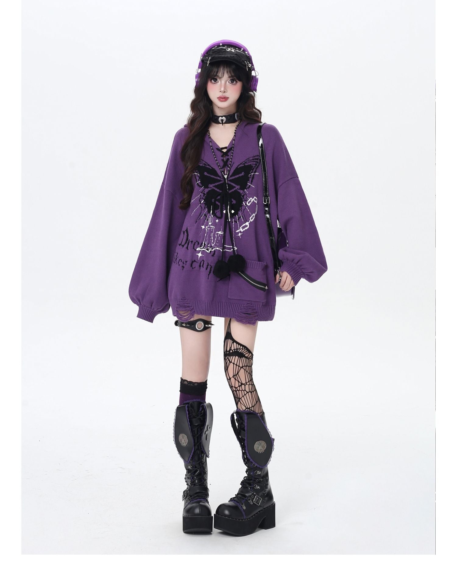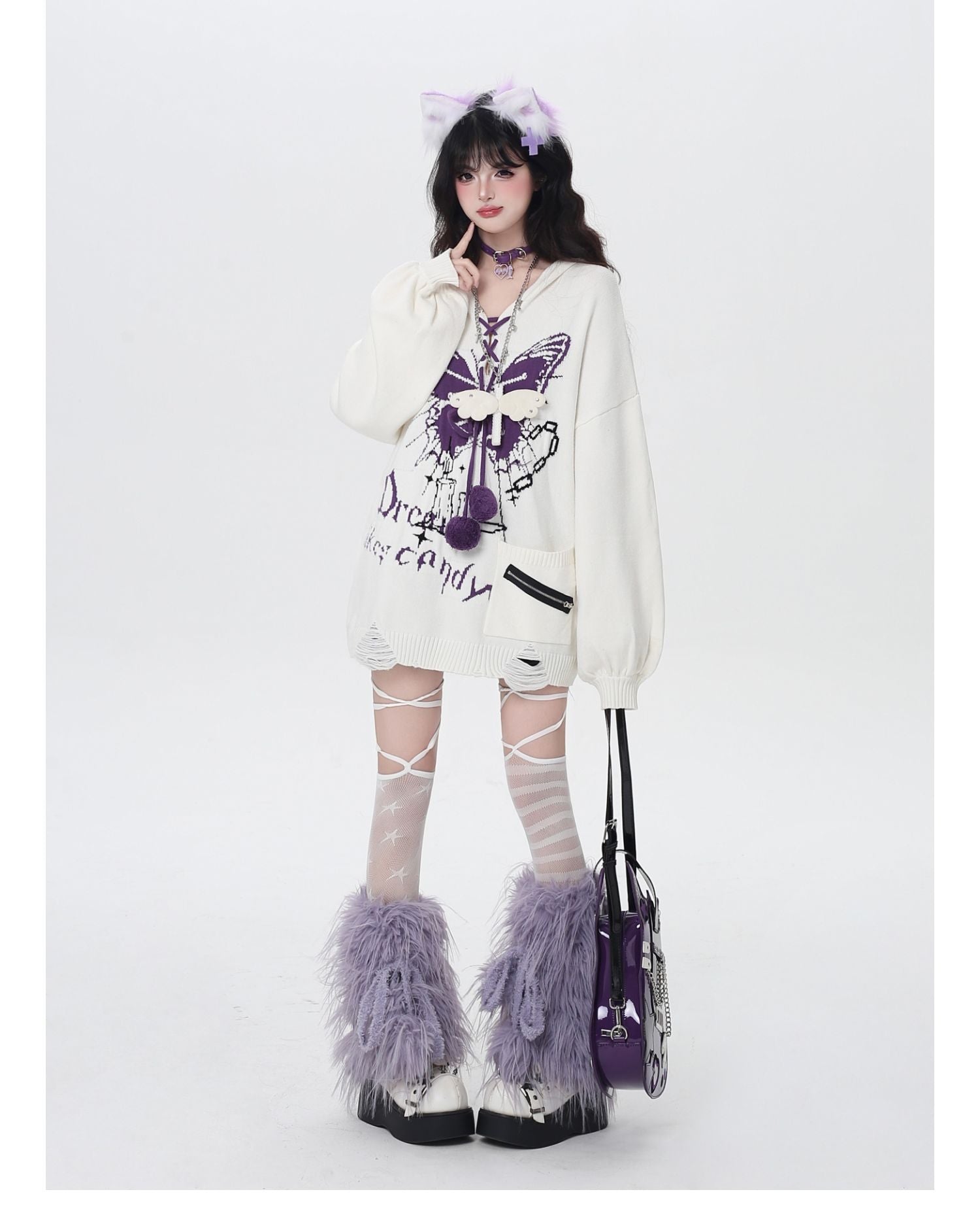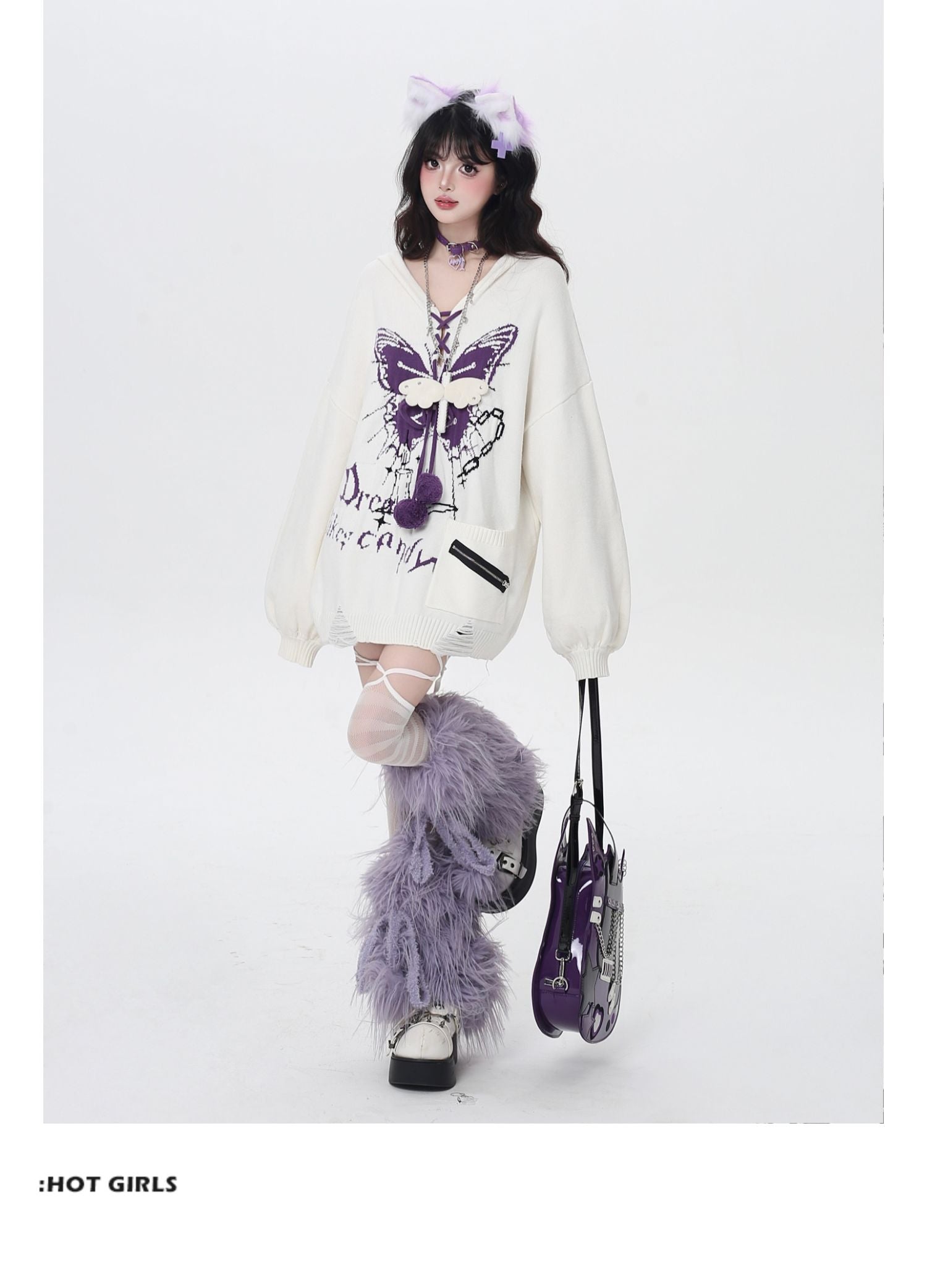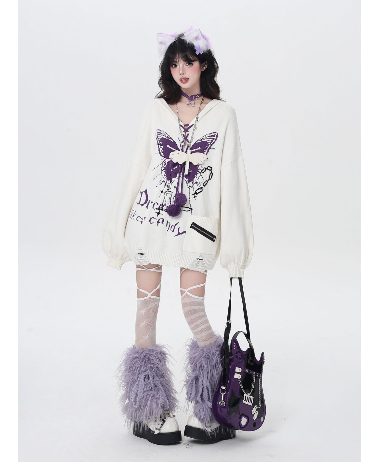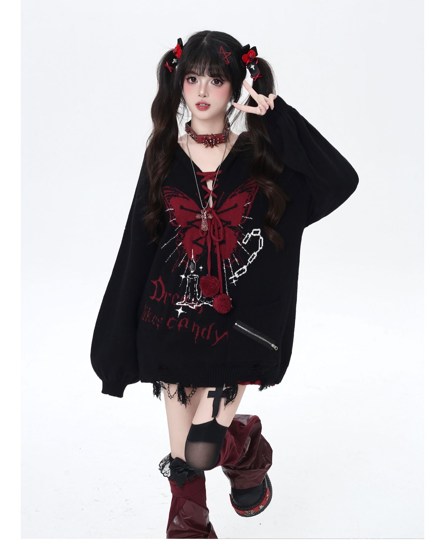ゆったりフードつきパーカー、スパイダーウェブと蝶のデザイン