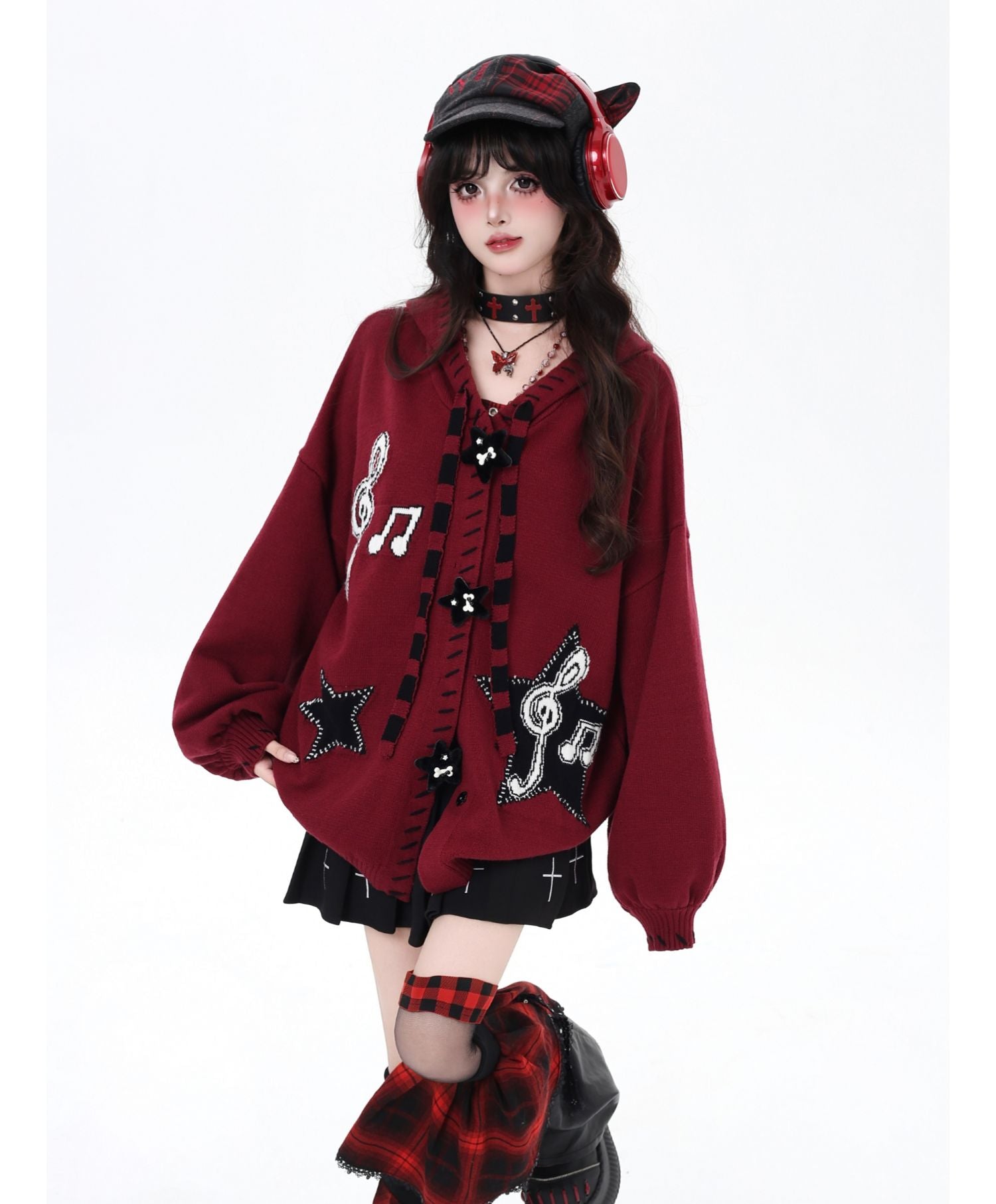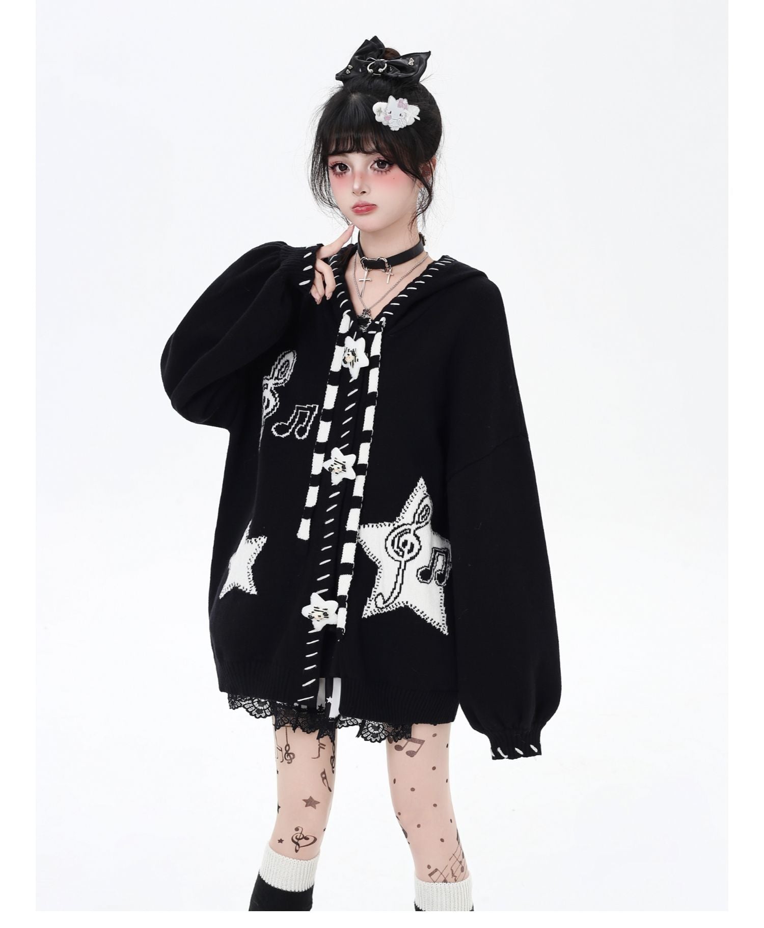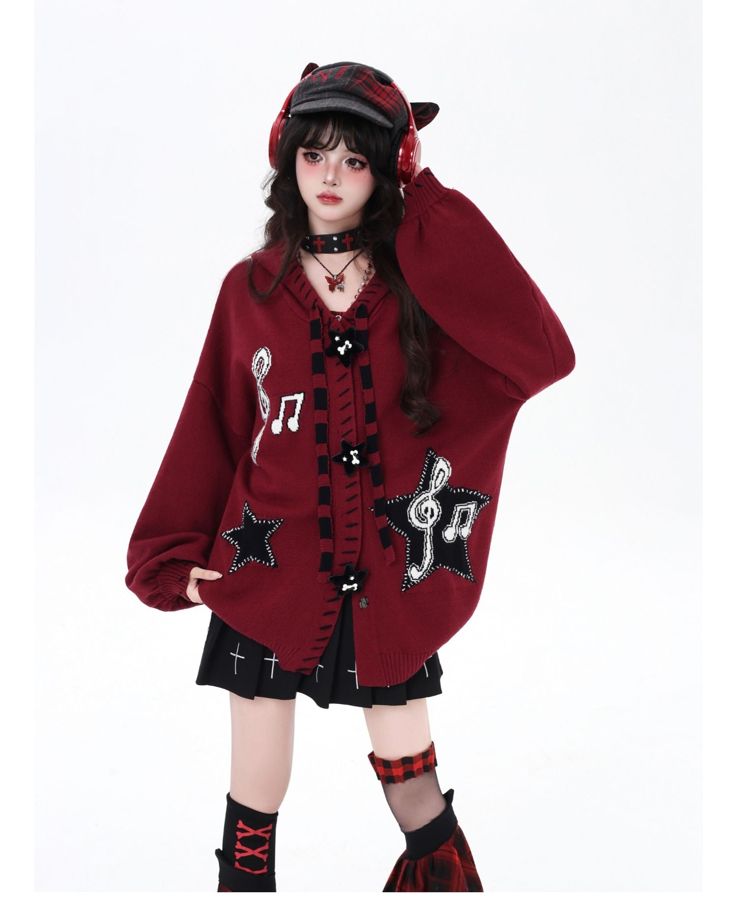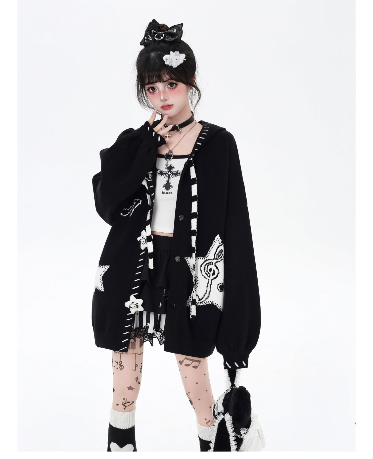 ブラック×レッドの星柄が印象的♡ ゆるめのランタンスリーブで抜け感たっぷり。甘めなのにクールな雰囲気が楽しめる、秋冬の#ゆる地雷コーデ にぴったりなデザインカーディガン。