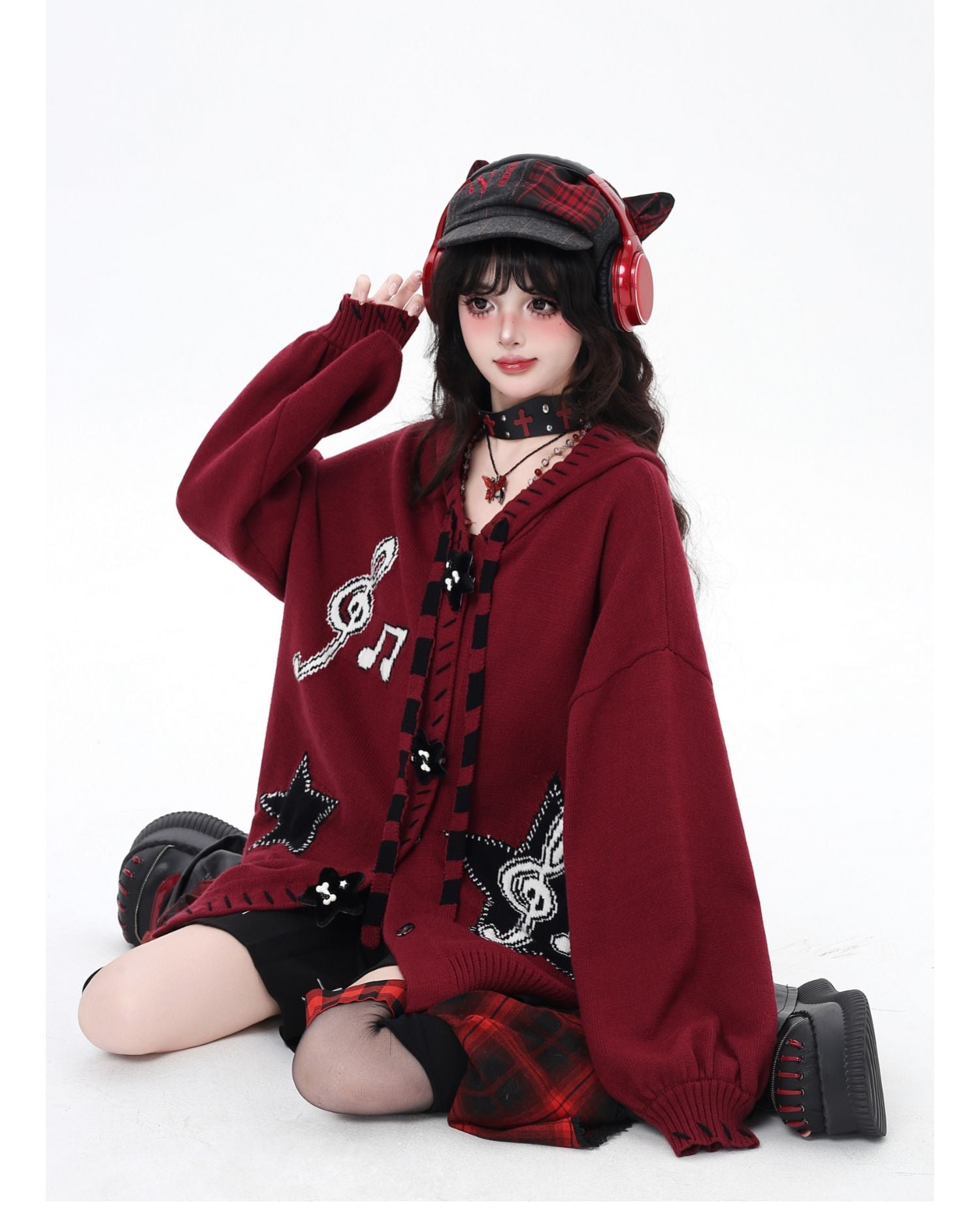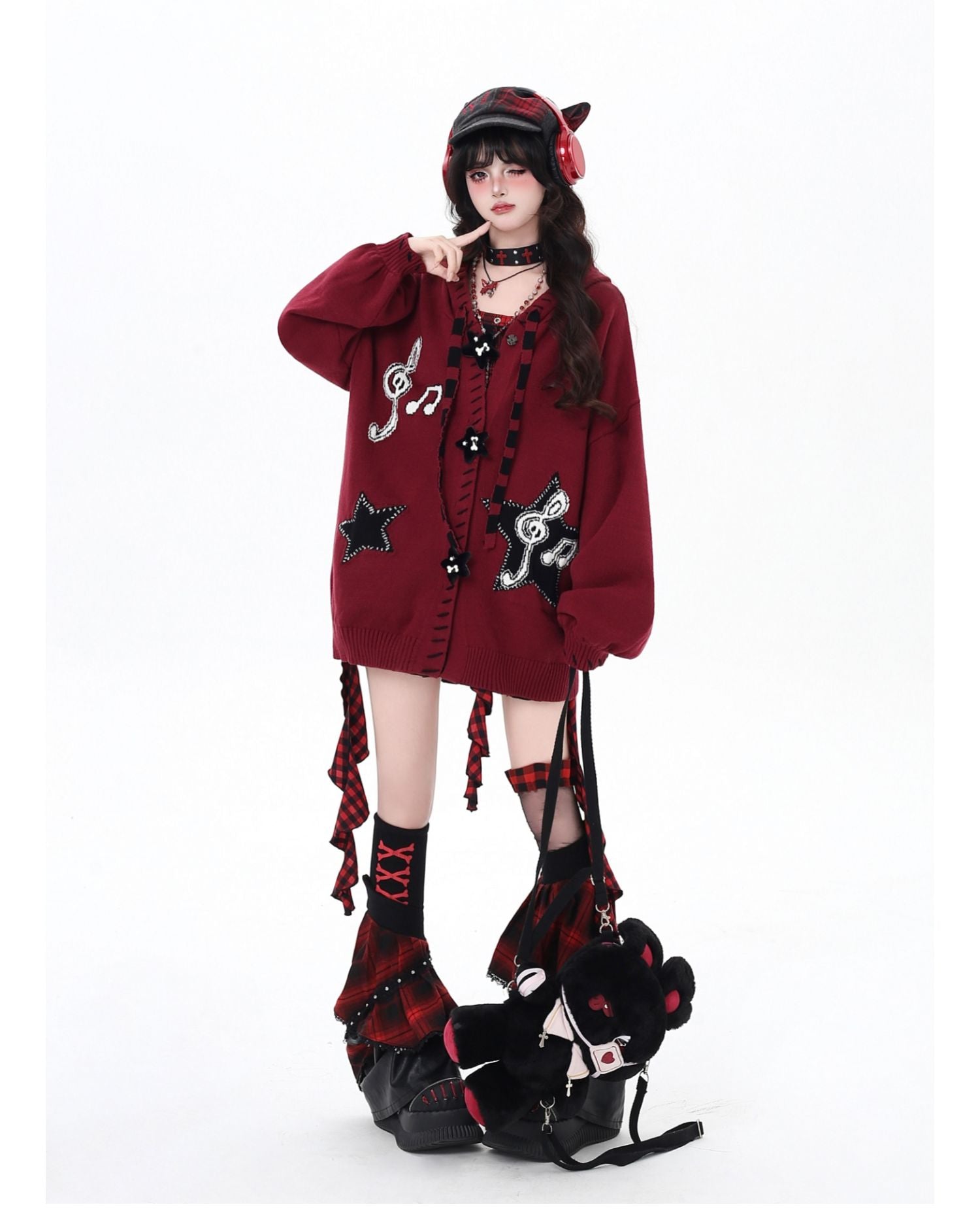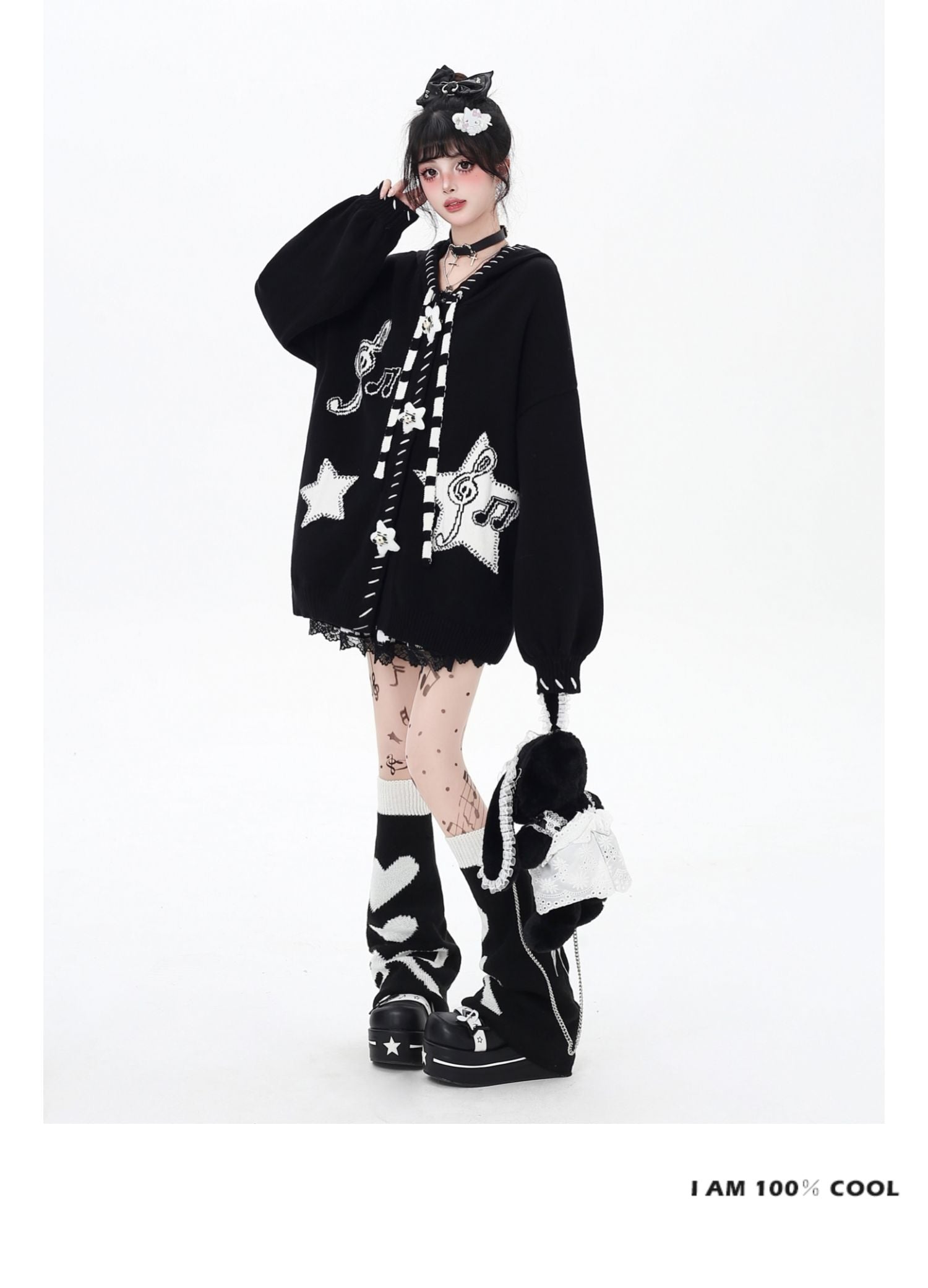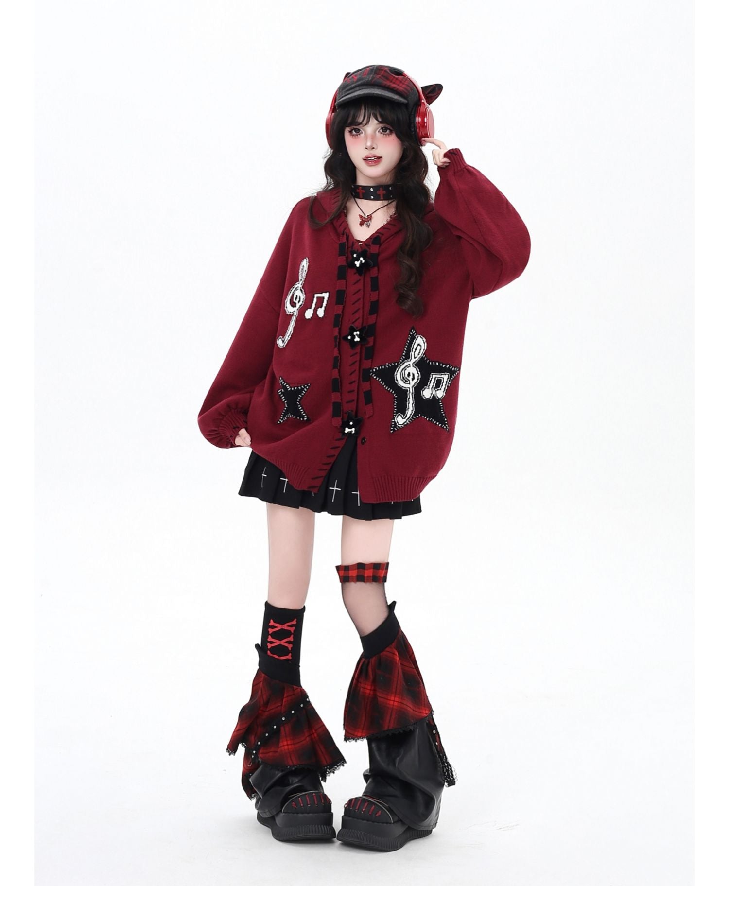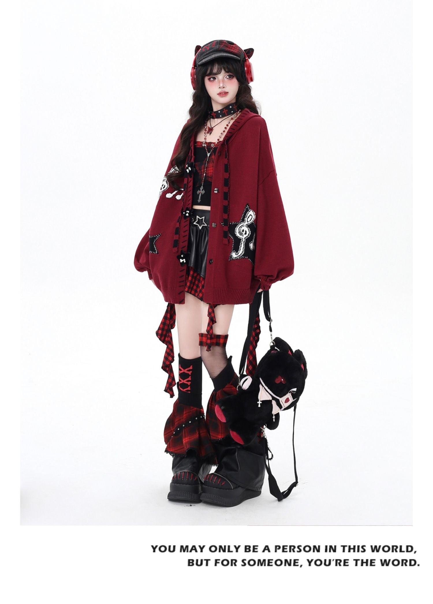 ブラック×レッドの星柄が印象的♡ ゆるめのランタンスリーブで抜け感たっぷり。甘めなのにクールな雰囲気が楽しめる、秋冬の#ゆる地雷コーデ にぴったりなデザインカーディガン。