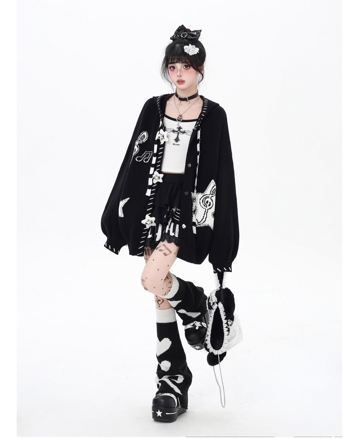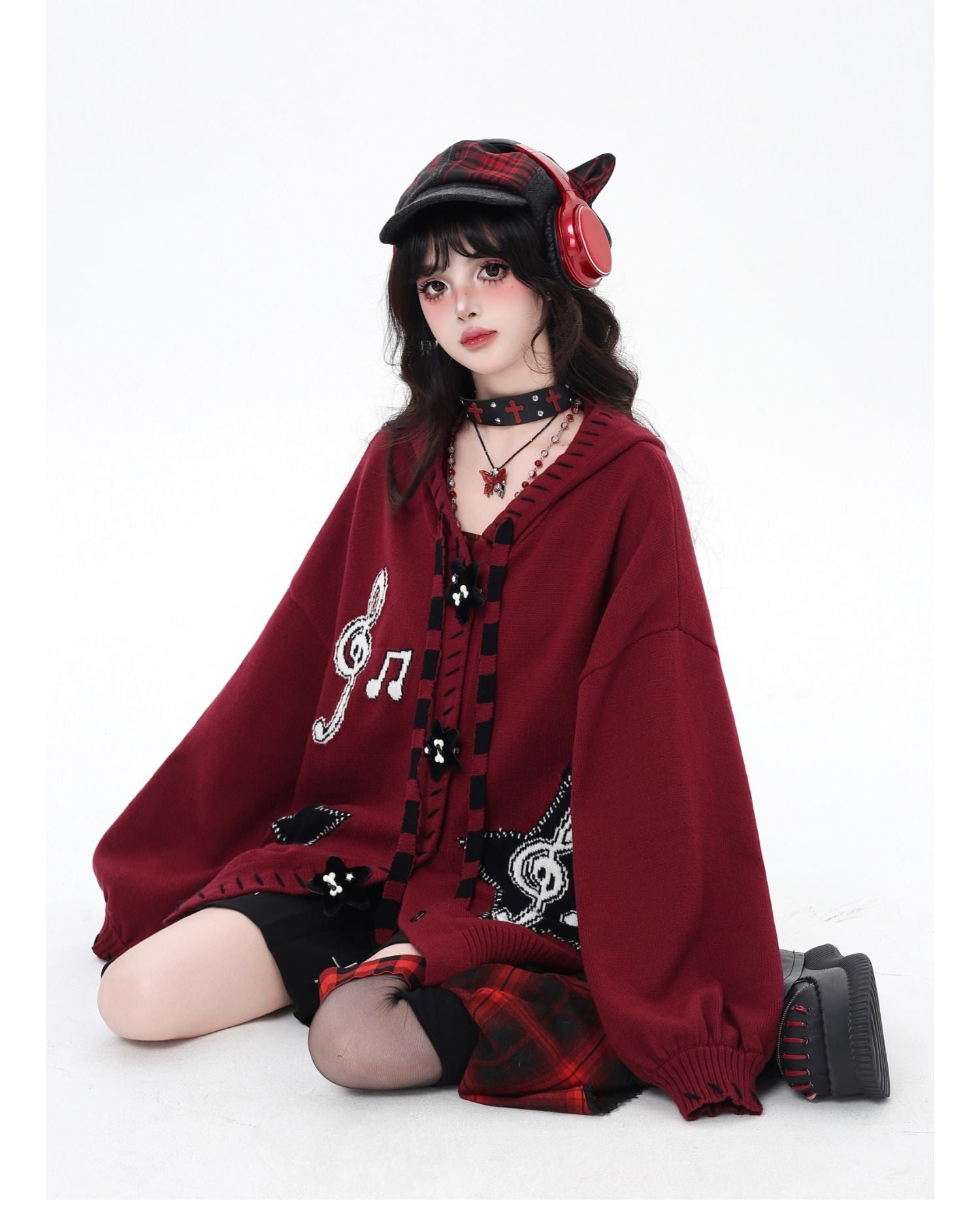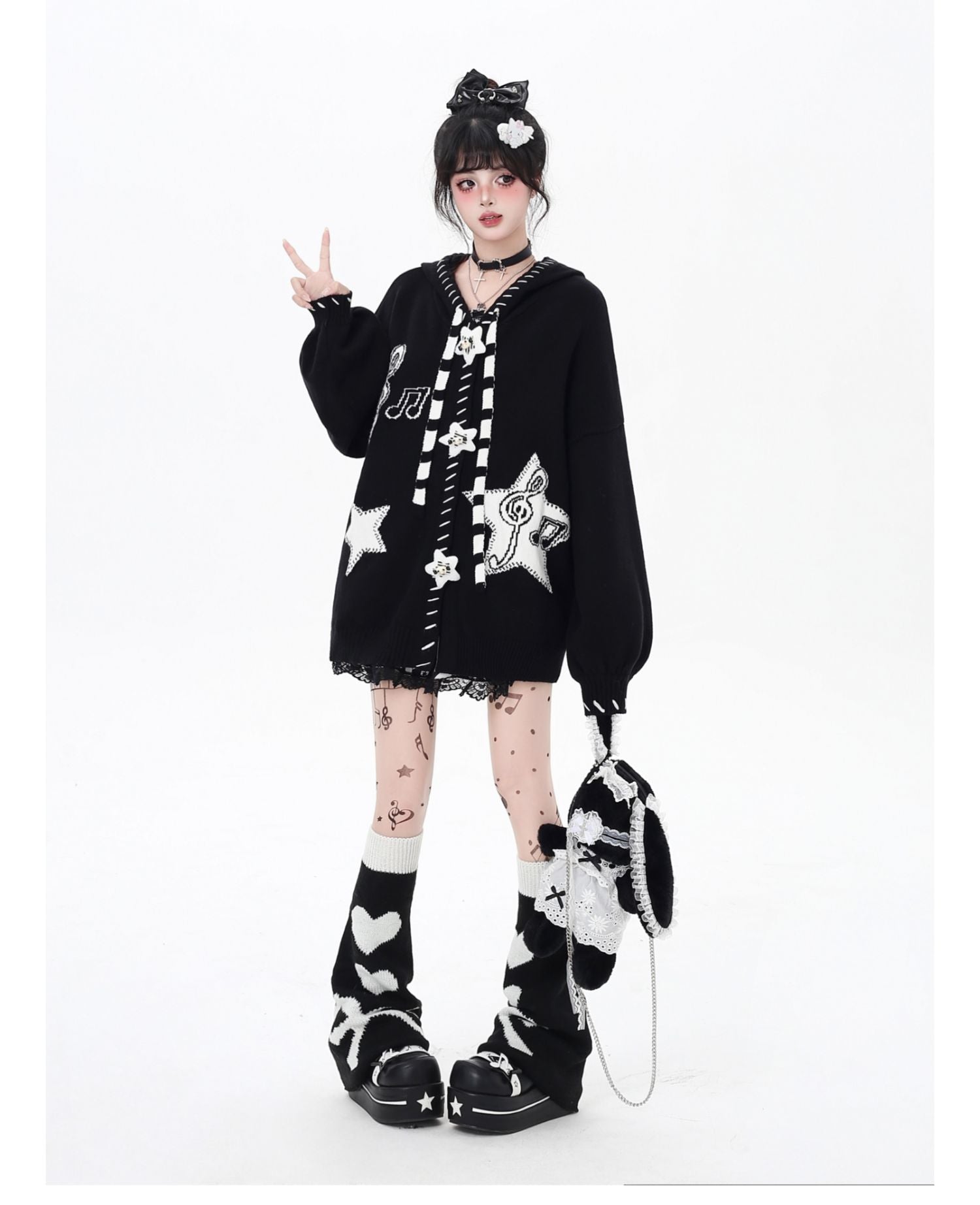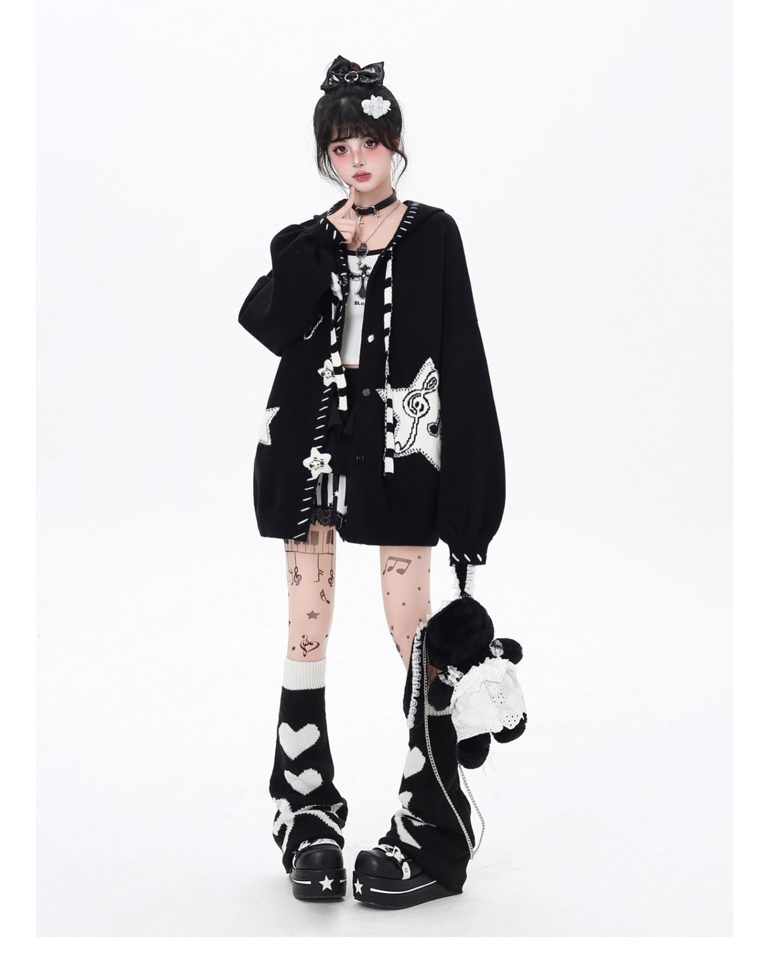 ブラック×レッドの星柄が印象的♡ ゆるめのランタンスリーブで抜け感たっぷり。甘めなのにクールな雰囲気が楽しめる、秋冬の#ゆる地雷コーデ にぴったりなデザインカーディガン。