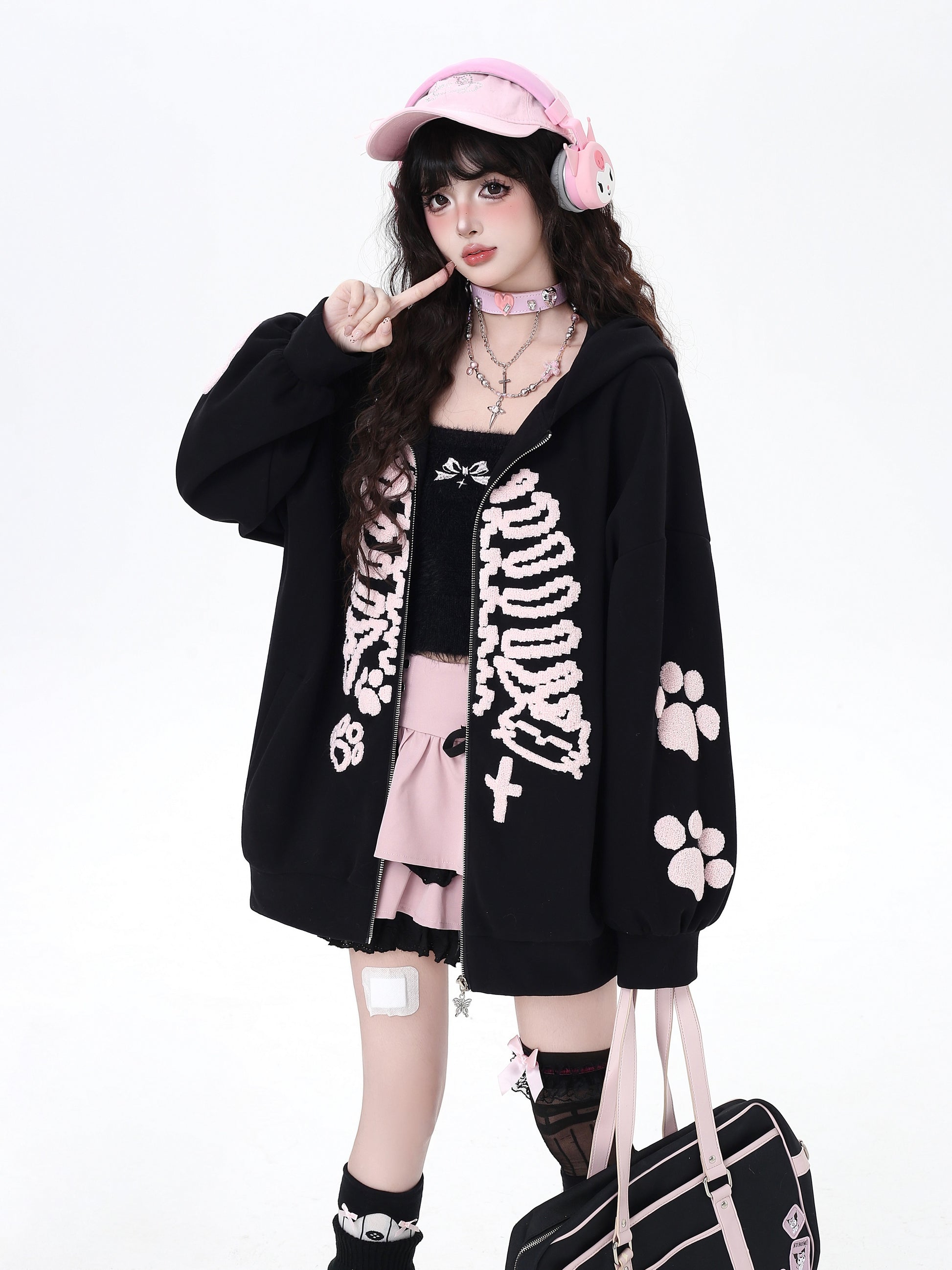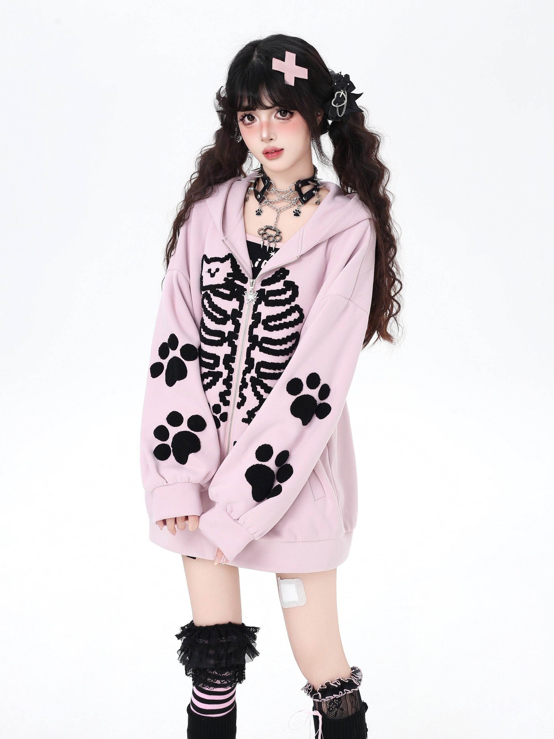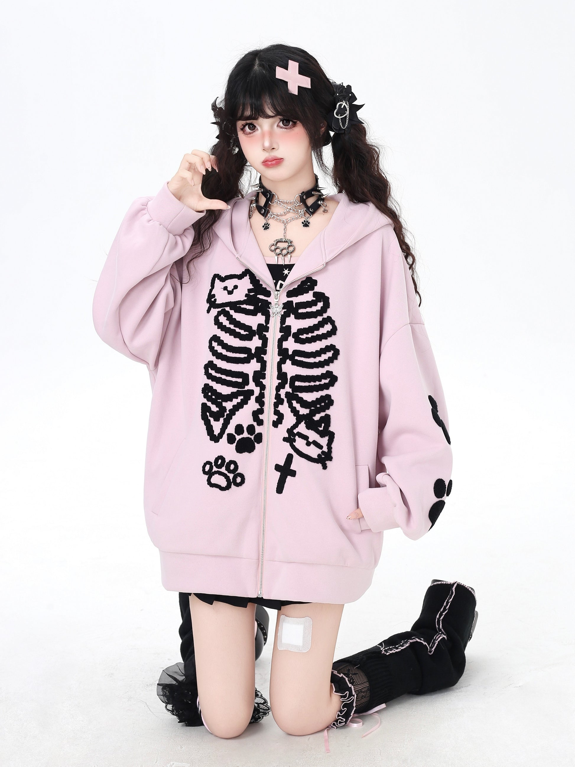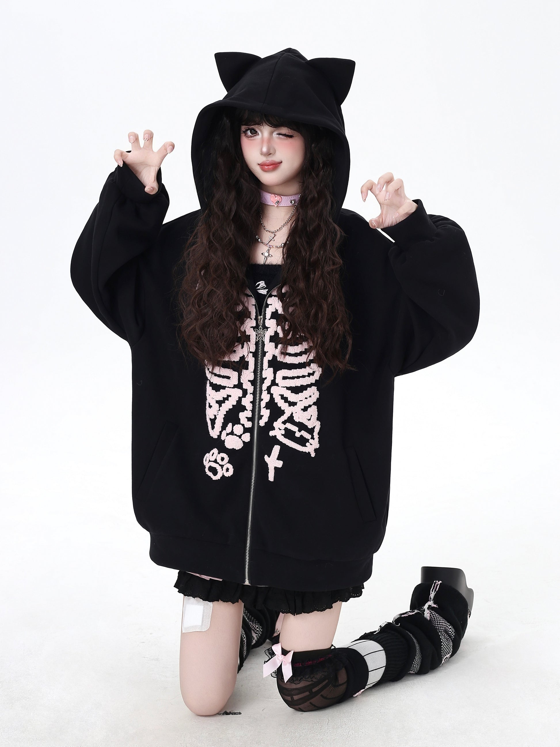 猫と骨格の刺繍がアクセント♡ ゆったりシルエットで着心地抜群、甘辛ミックスの地雷系コーデや秋のカジュアルスタイルにぴったりなスウェットです。
