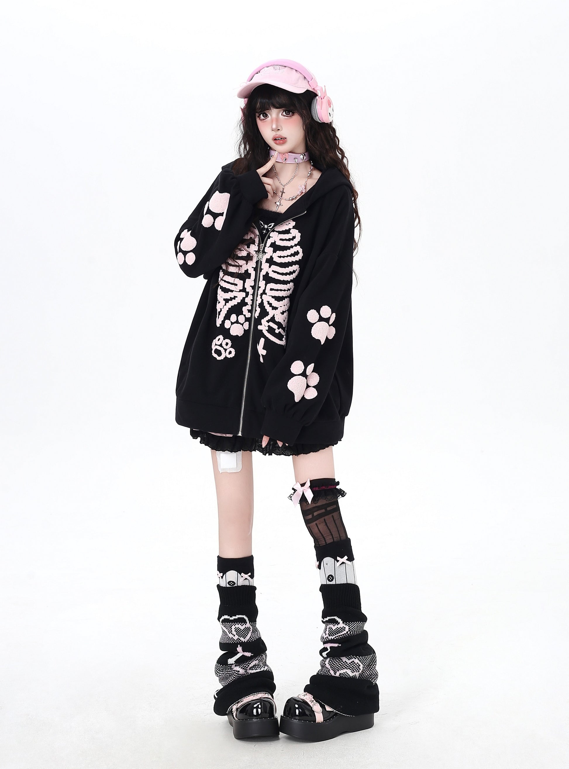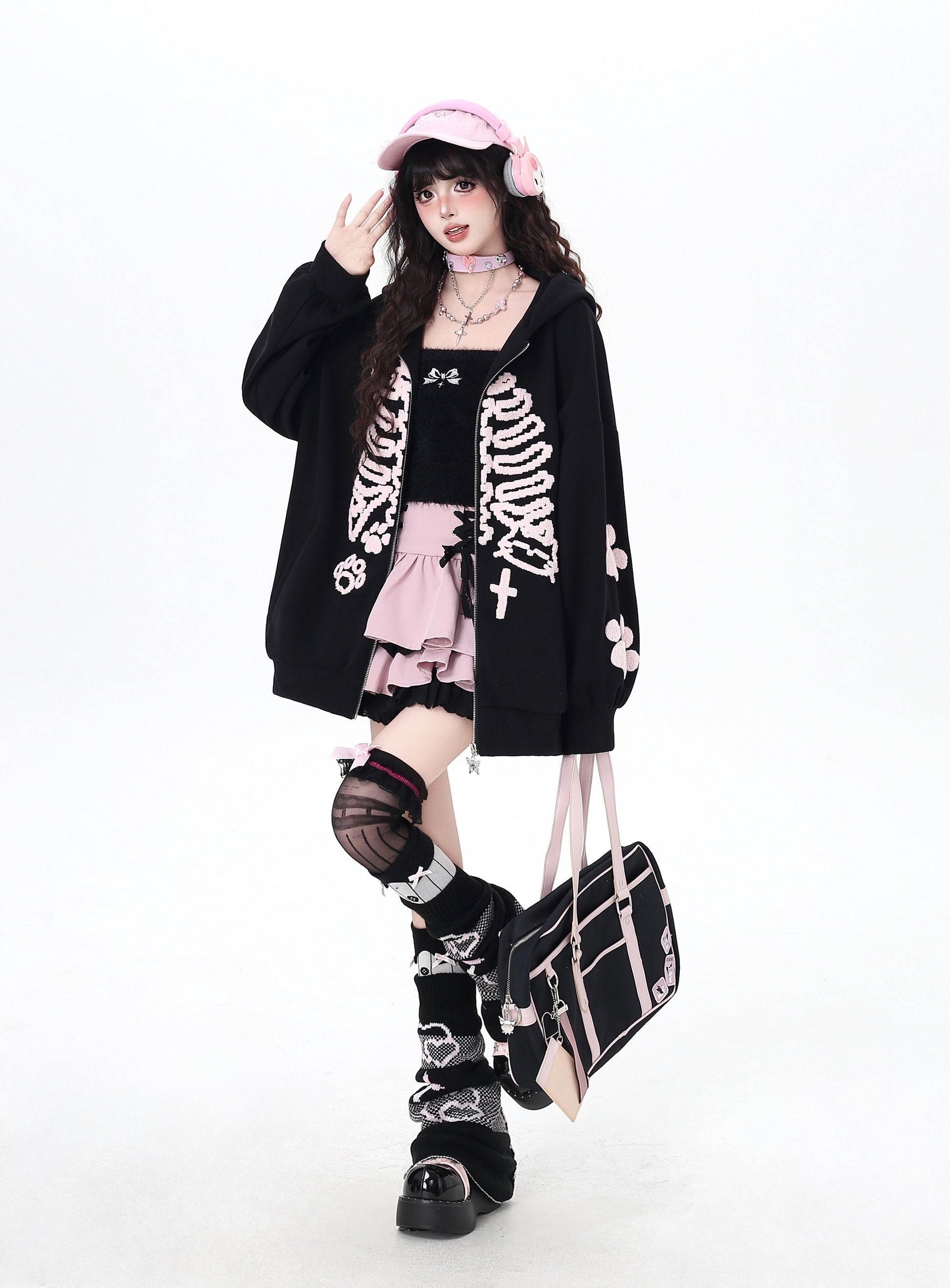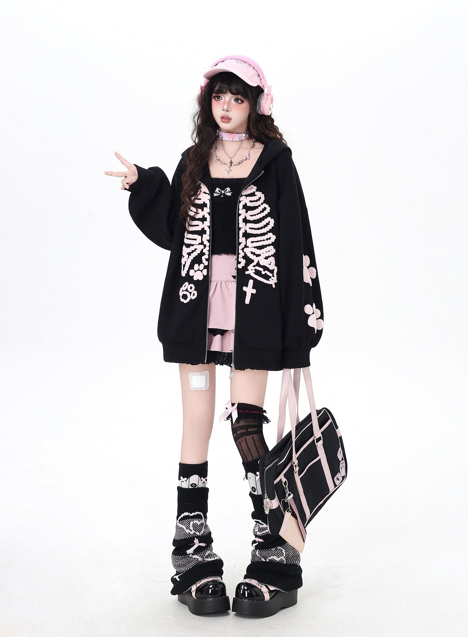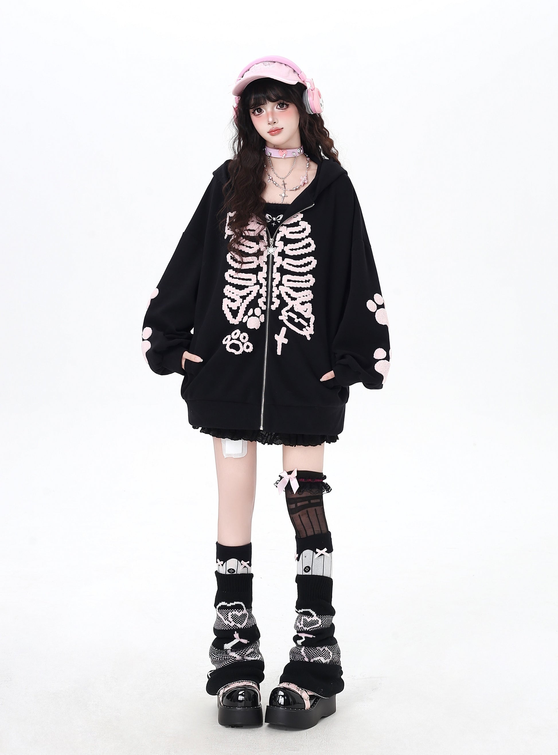 猫と骨格の刺繍がアクセント♡ ゆったりシルエットで着心地抜群、甘辛ミックスの地雷系コーデや秋のカジュアルスタイルにぴったりなスウェットです。