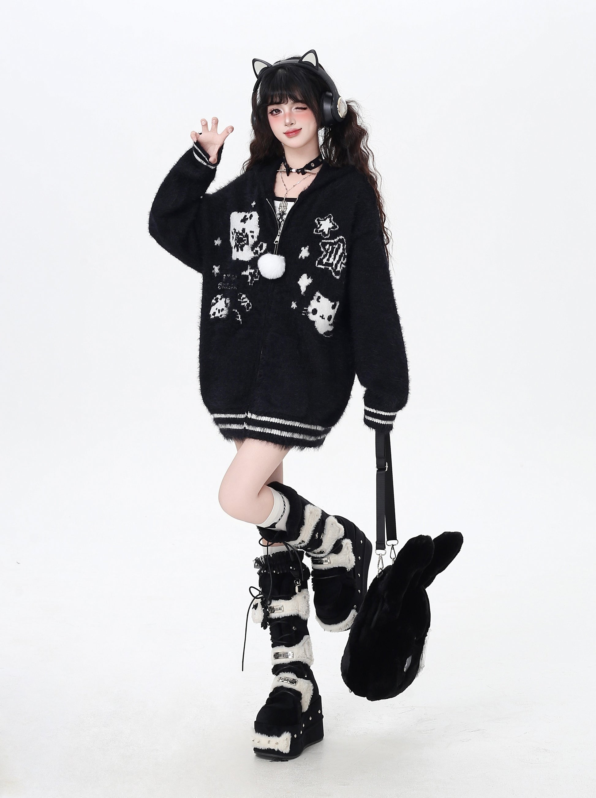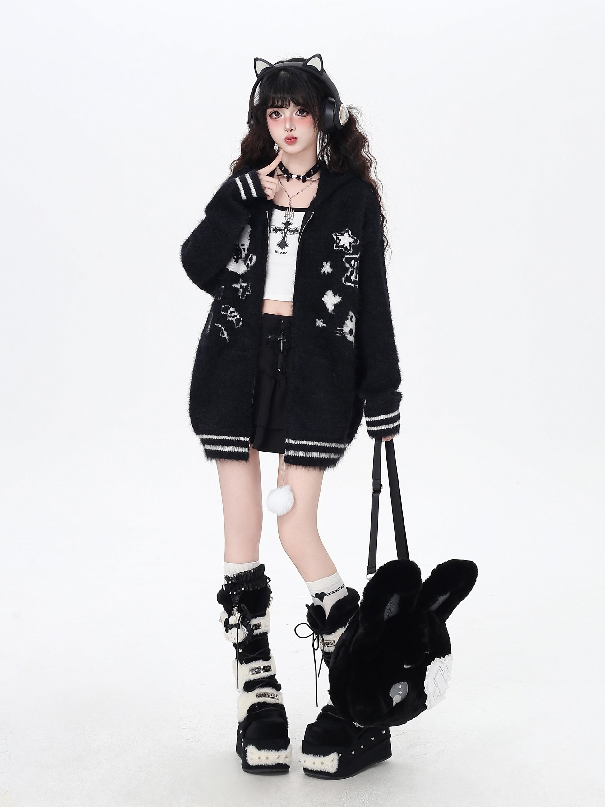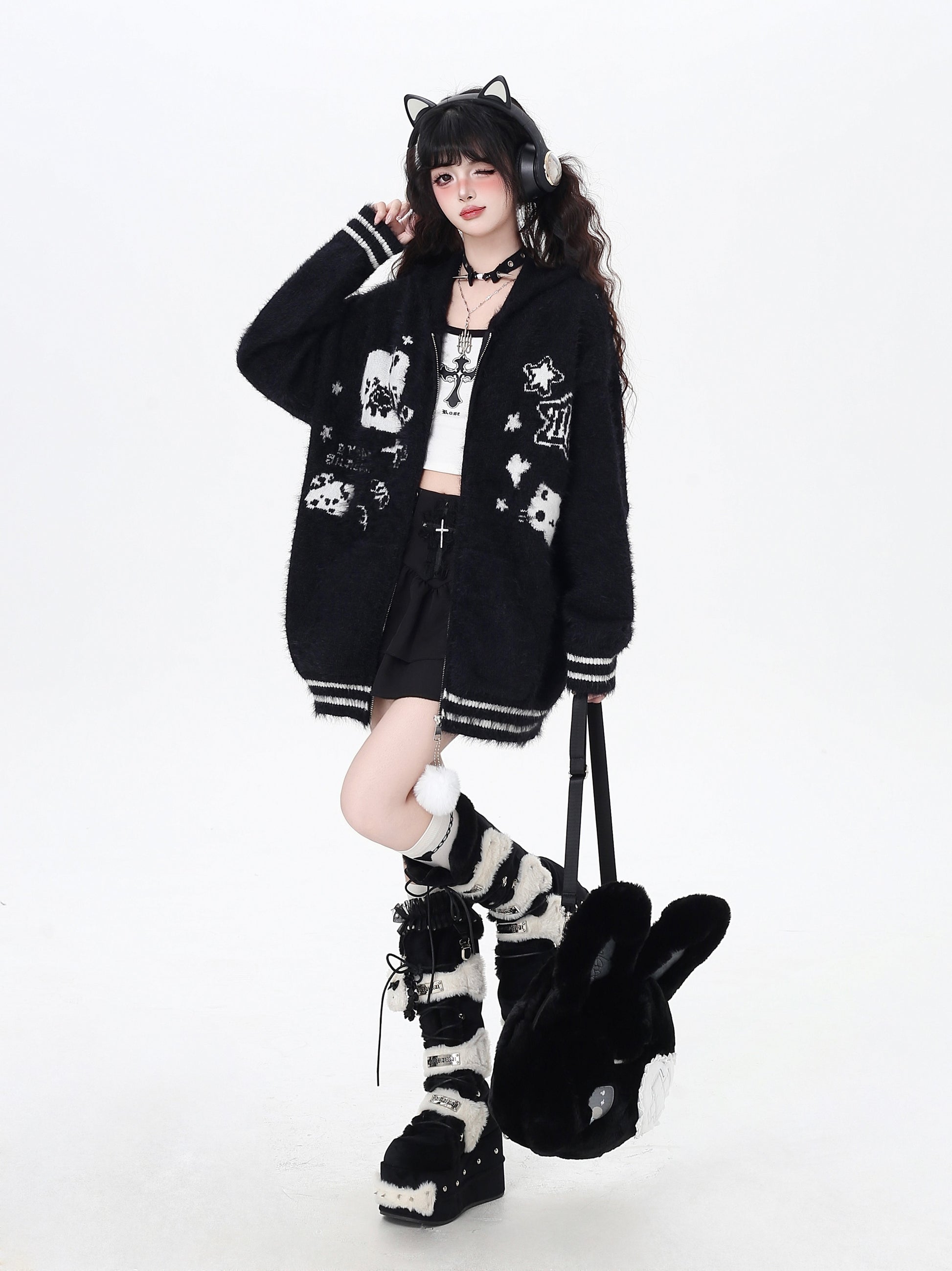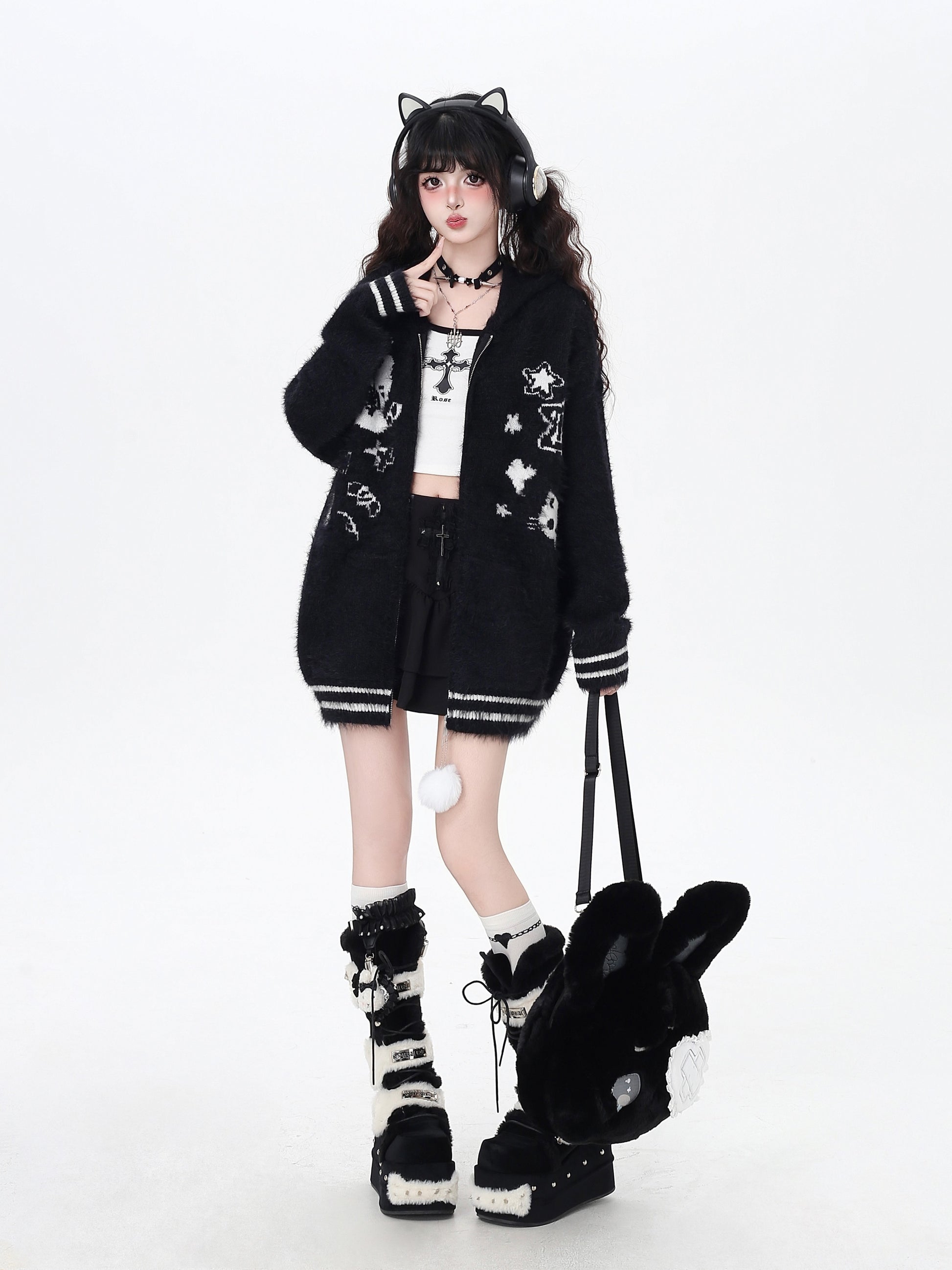 ふわふわのうさ耳フードとゆるっとしたシルエットが可愛いカーディガン🖤 秋冬コーデにぴったりで、甘めだけどちょっぴりクールなデザインがポイント✨ デイリーからお出かけまで幅広く着回せます♡