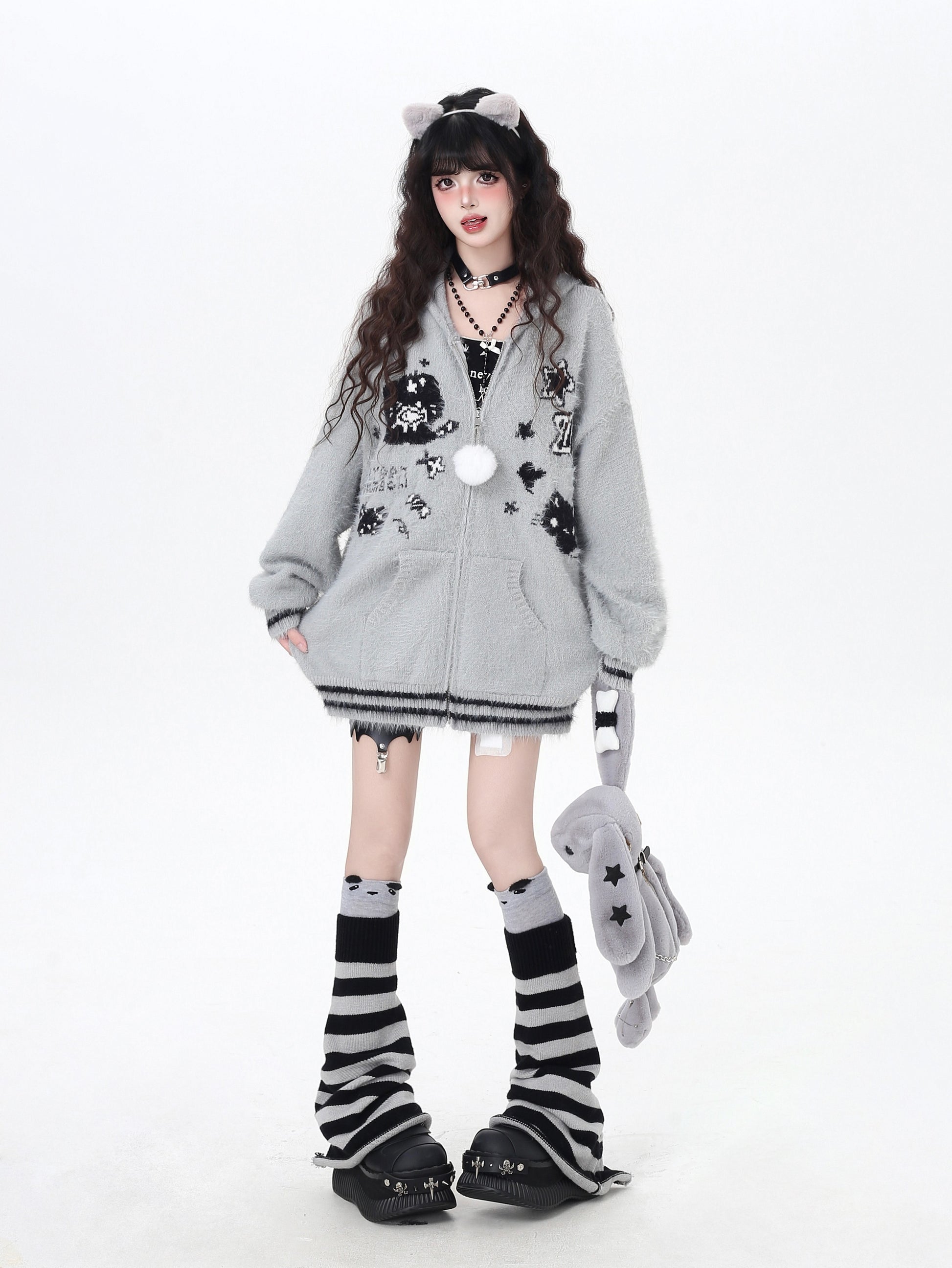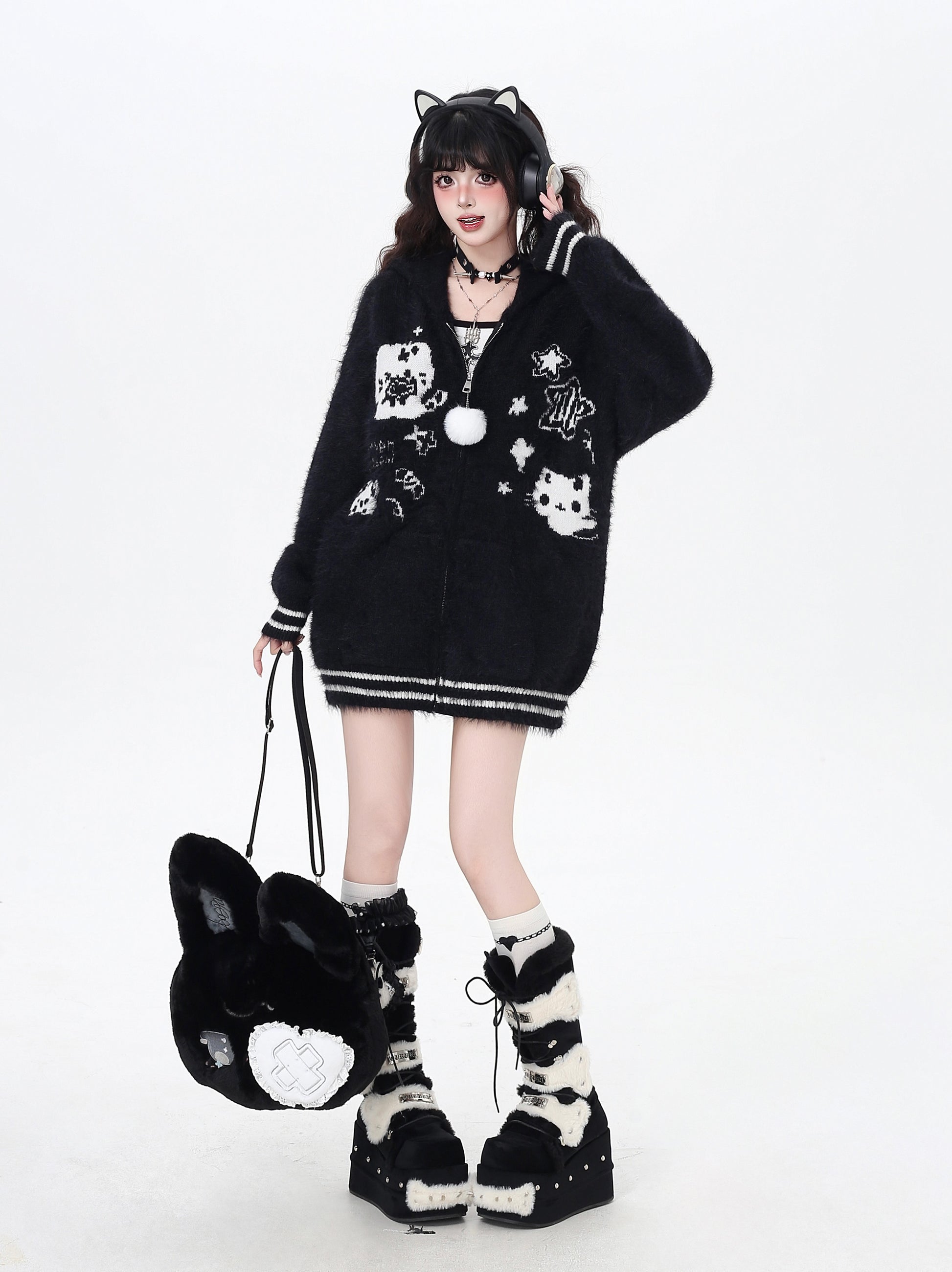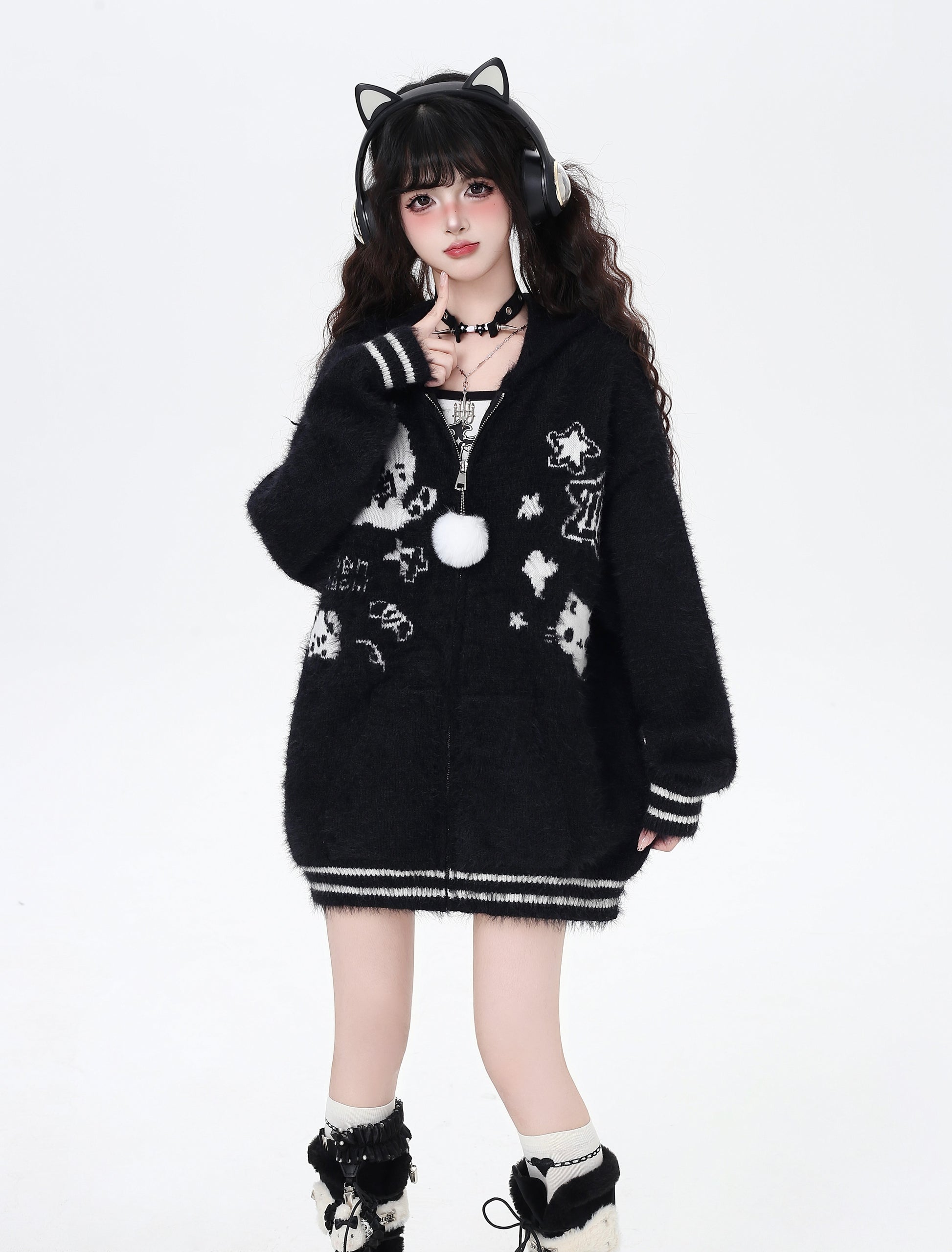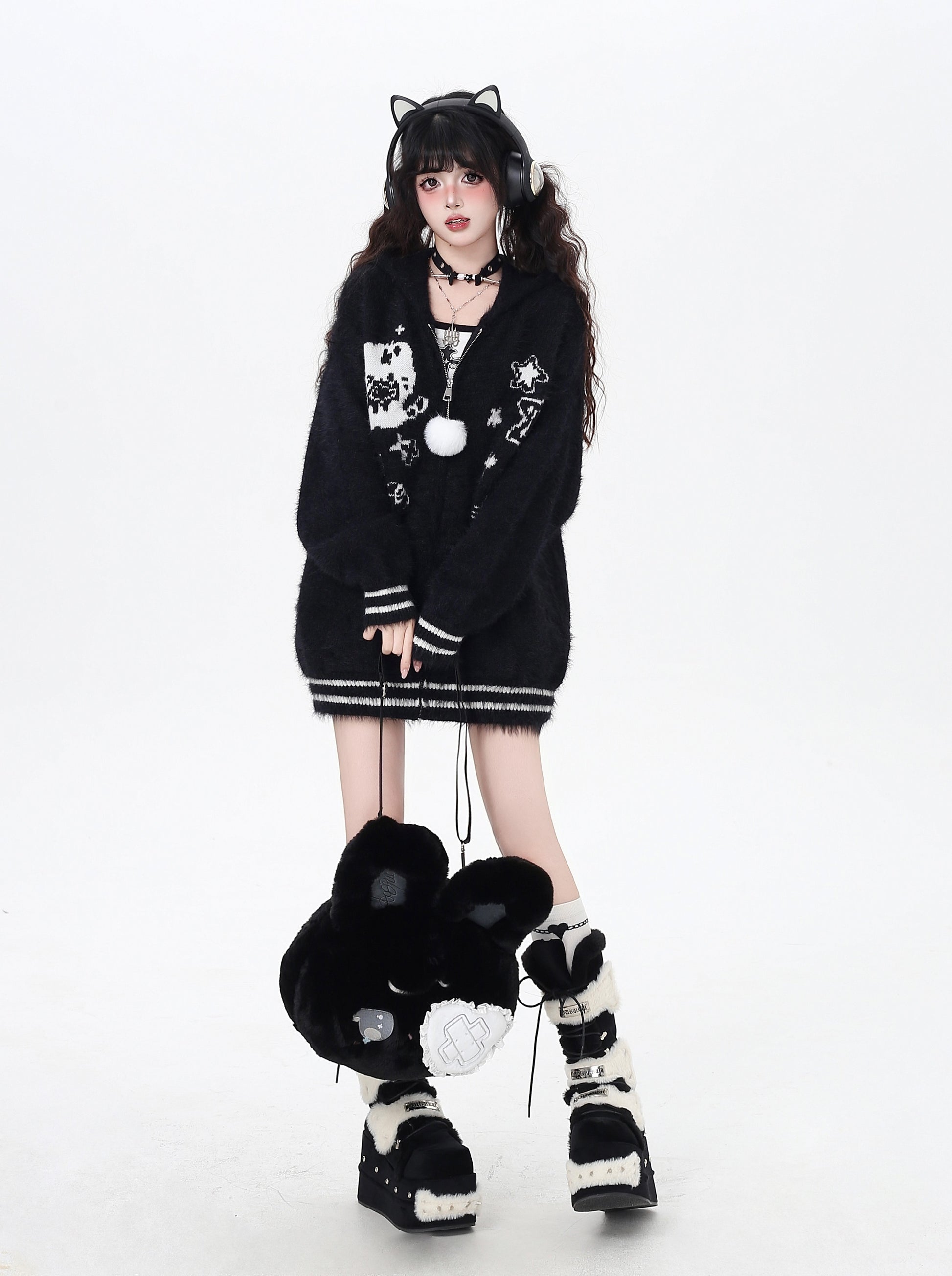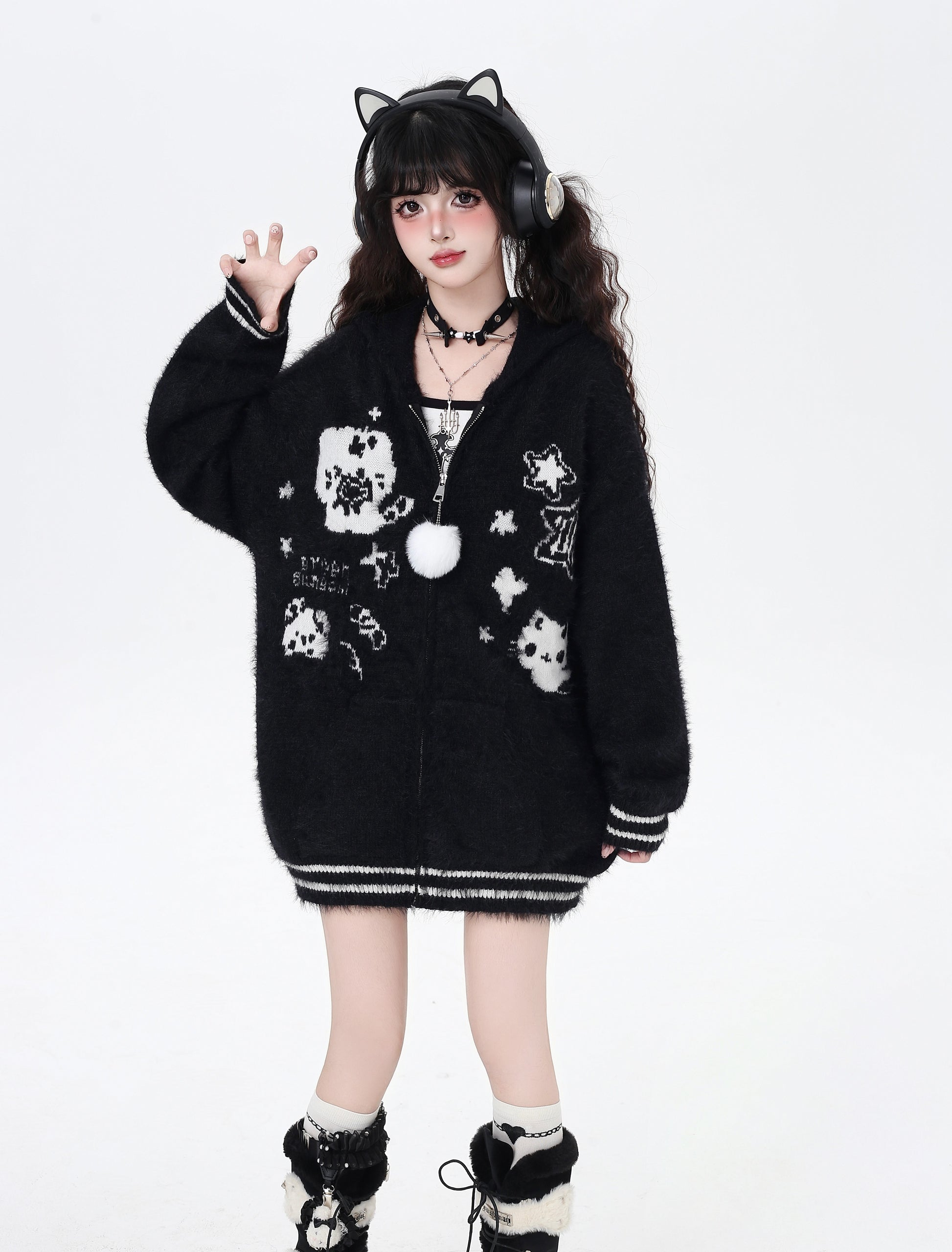 ふわふわのうさ耳フードとゆるっとしたシルエットが可愛いカーディガン🖤 秋冬コーデにぴったりで、甘めだけどちょっぴりクールなデザインがポイント✨ デイリーからお出かけまで幅広く着回せます♡