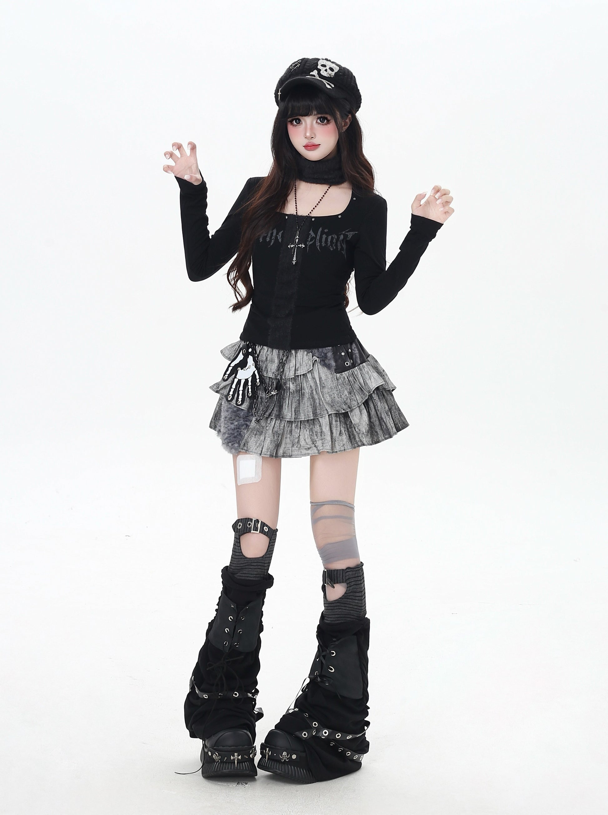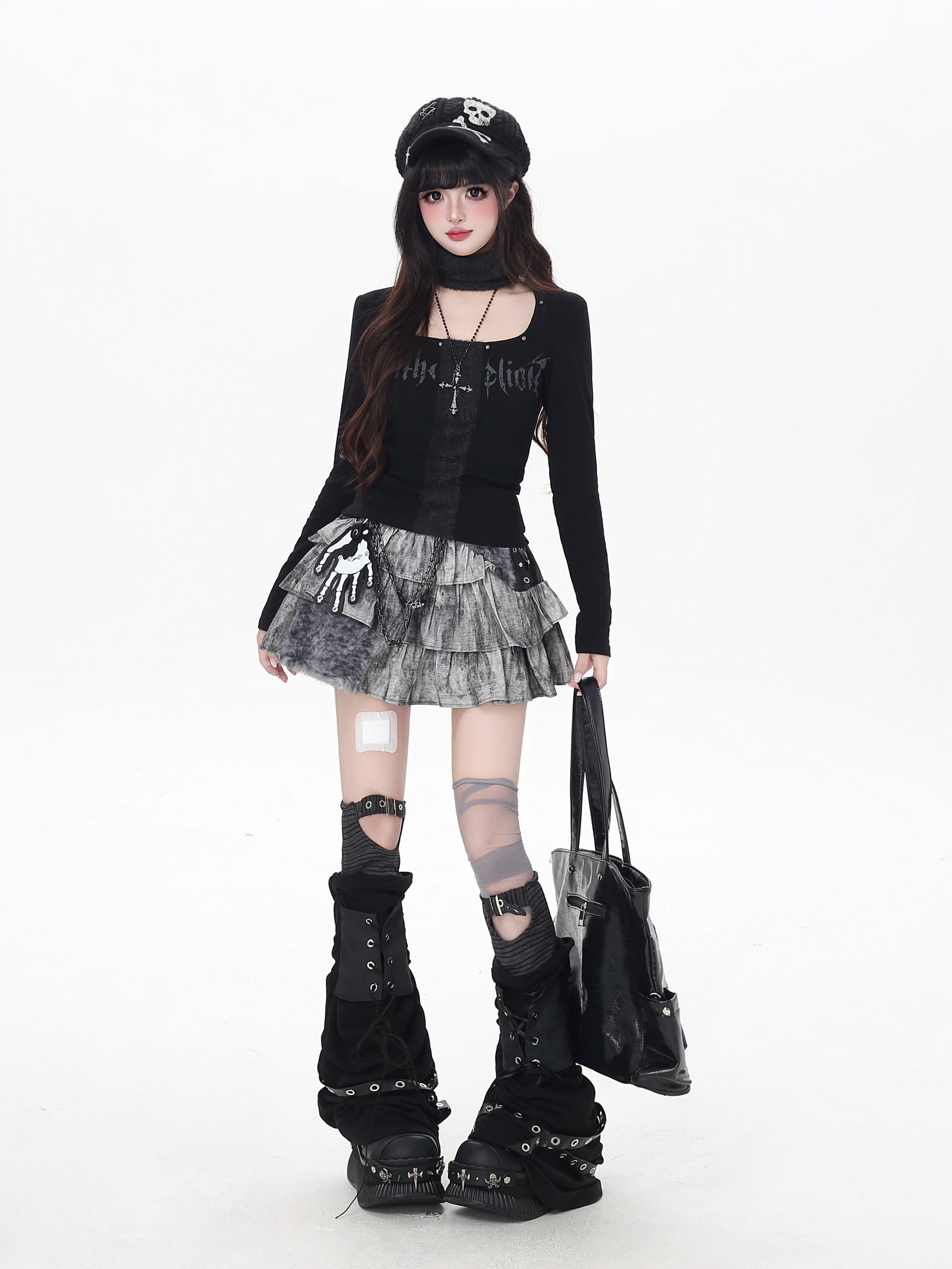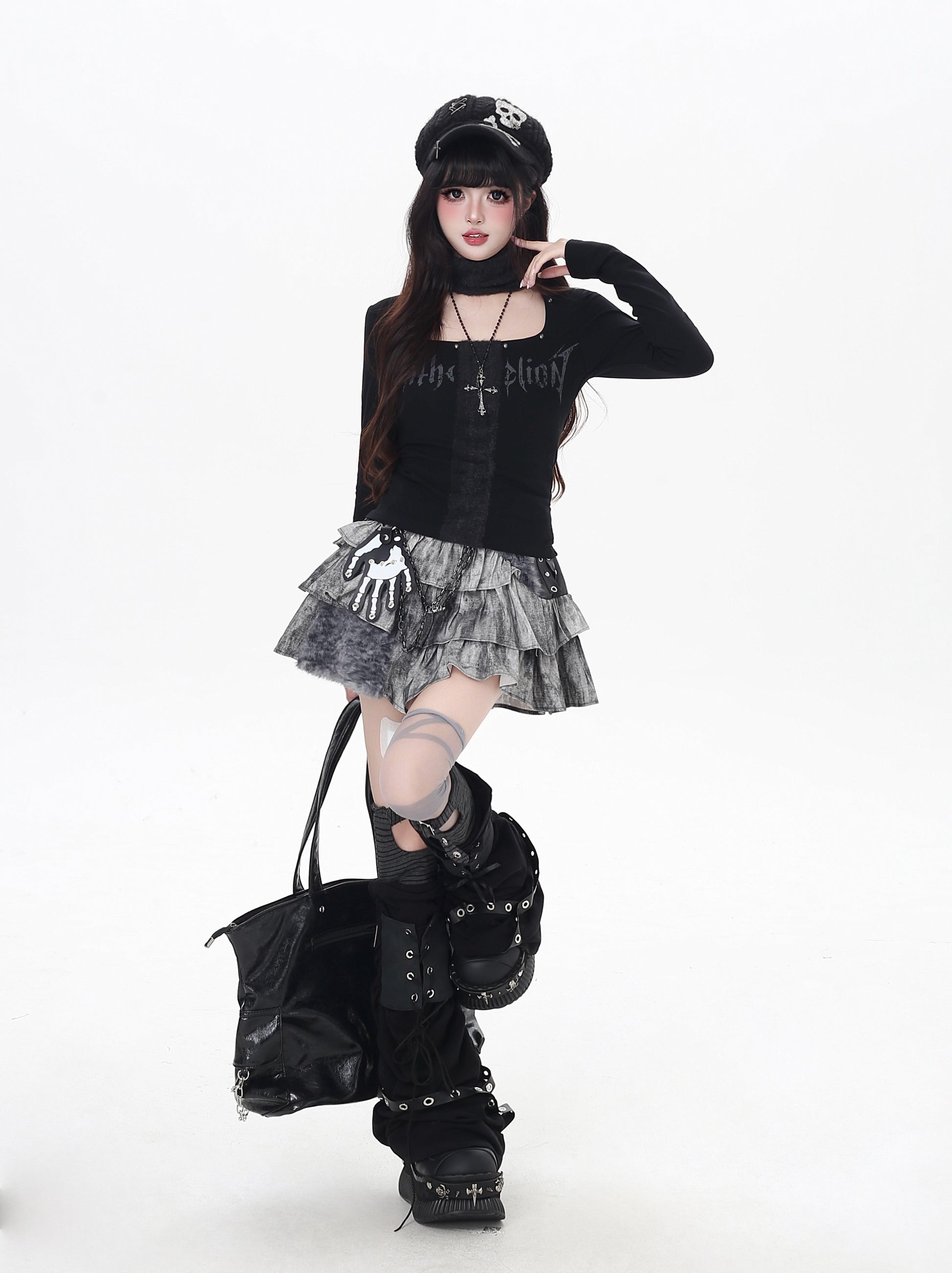 黒とグレーの配色がクールなY2Kゴシック長袖Tシャツ。