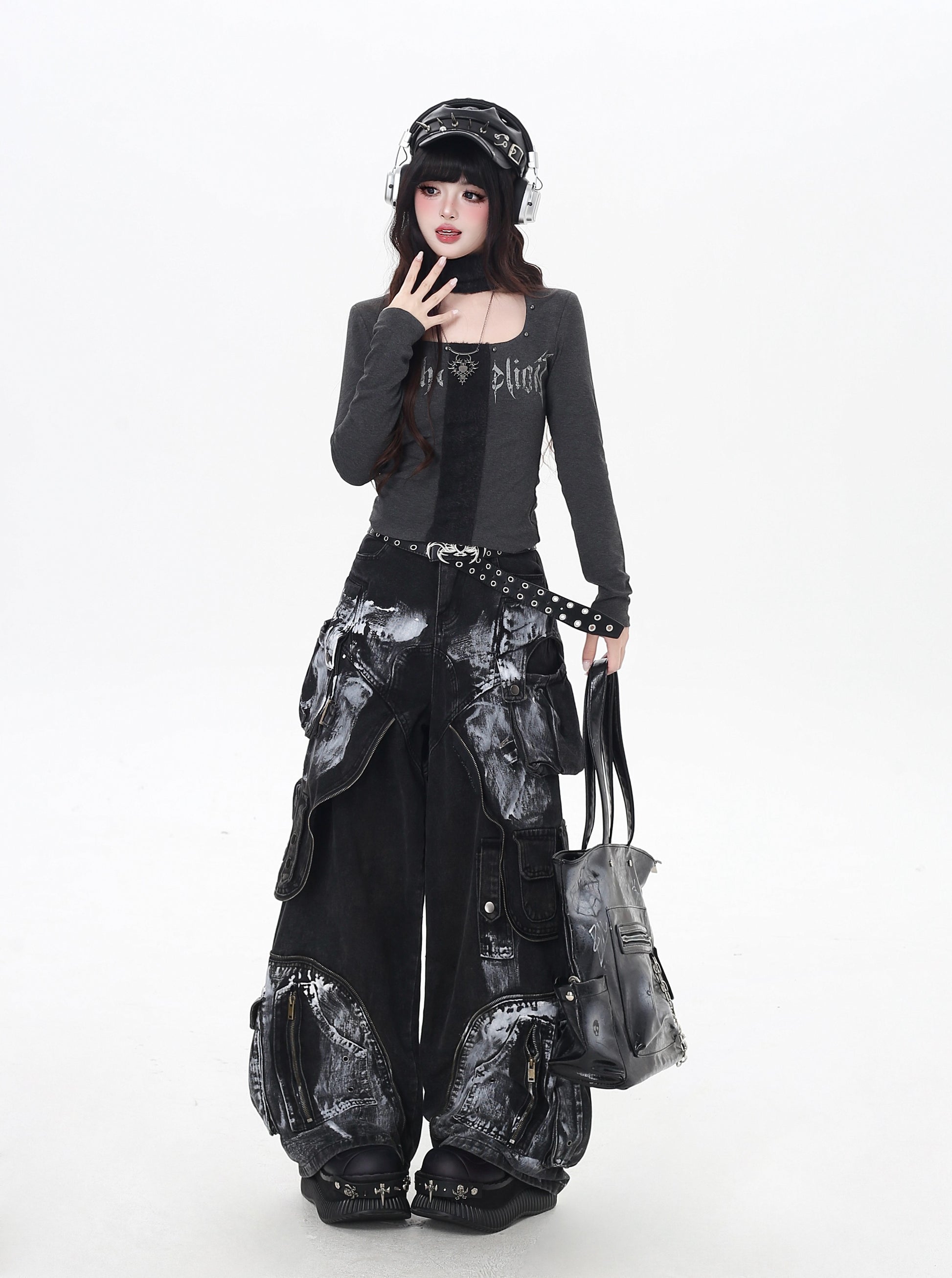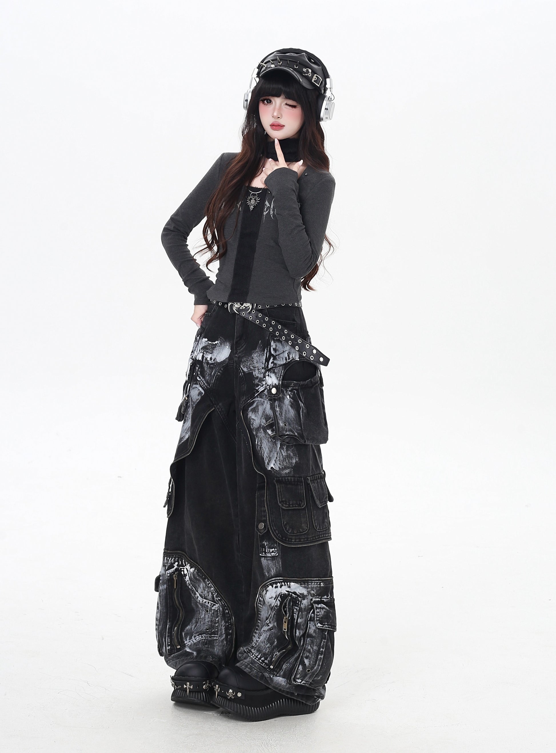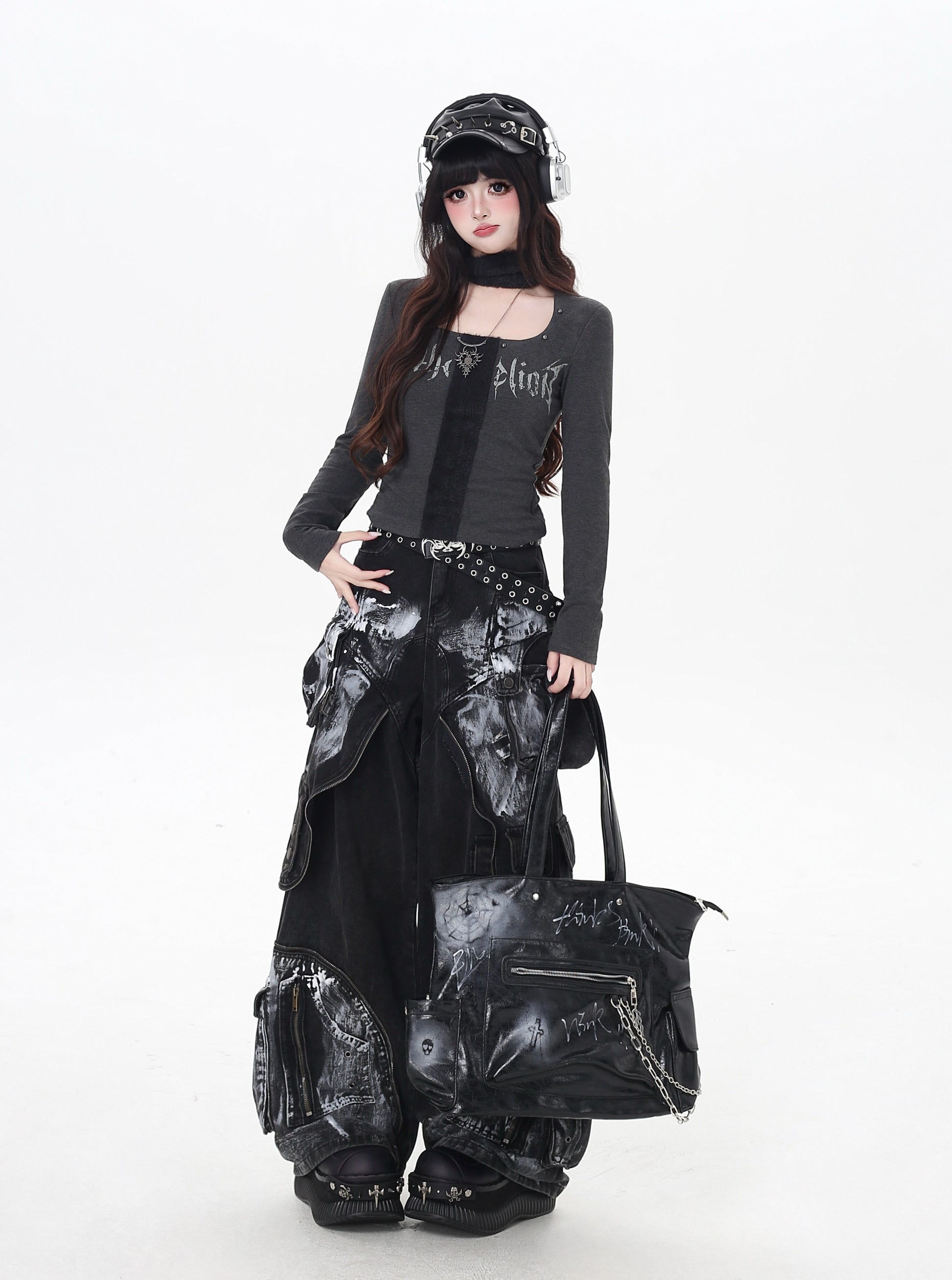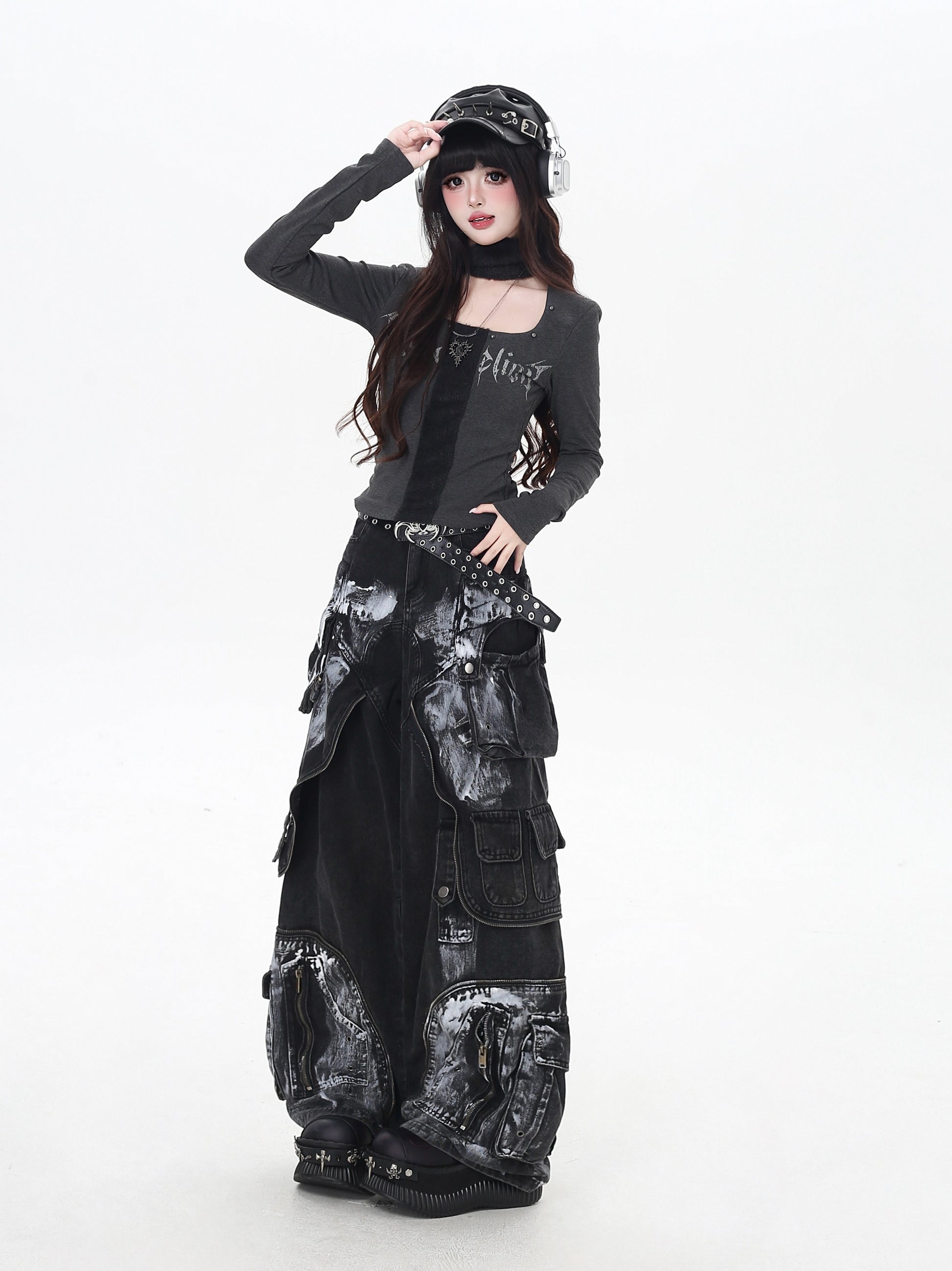 黒とグレーの配色がクールなY2Kゴシック長袖Tシャツ。