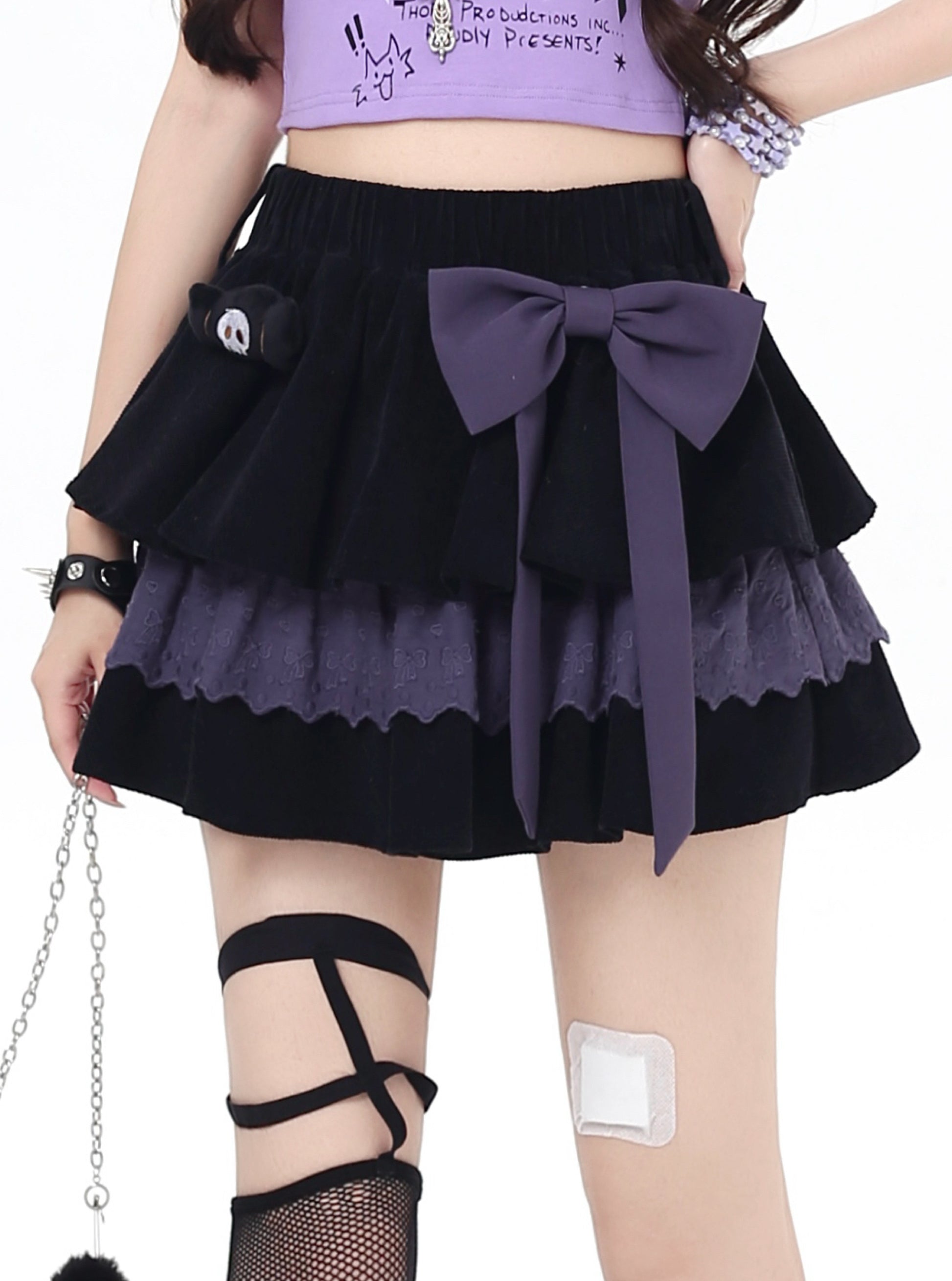 地雷系にぴったりな黒紫カラーのリボン付きコーデュロイケーキスカート。秋冬の甘辛ミックスコーデにおすすめの小众デザインで、ゆるかわ女子にも人気です。