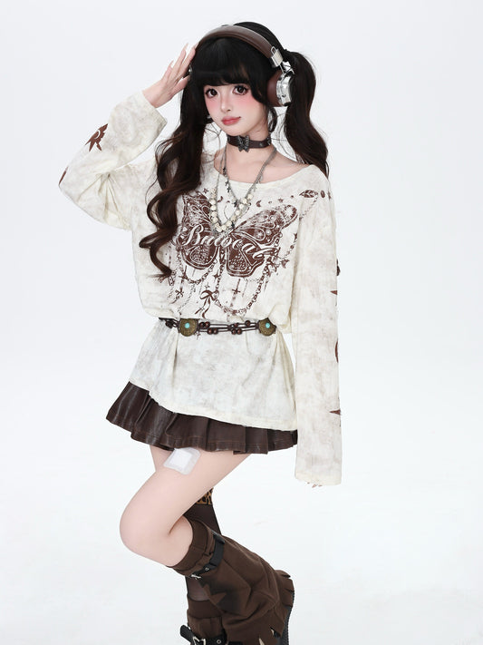 クラッシュ加工 バタフライ柄ロングスリーブT